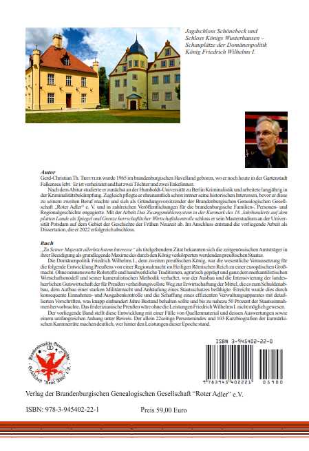 Autor Gerd-Christian Th. Treutler wurde 1965 im brandenburgischen Havelland geboren, wo er noch heute in der Gartenstadt Falkensee lebt. Er ist verheiratet und hat zwei Töchter und zwei Enkelinnen. Nach dem Abitur studierte er zunächst an der Humboldt-Universität zu Berlin Kriminalistik und arbeitete langjährig in der Kriminalitätsbekämpfung. Zugleich pflegte er ehrenamtlich schon immer seine historischen Interessen, bevor er diese zu seinem zweiten Beruf machte und sich als Gründungsvorsitzender der Brandenburgischen Genealogischen Gesellschaft „Roter Adler“ e. V. und in zahlreichen Veröffentlichungen für die brandenburgische Familien-, Personen- und Regionalgeschichte engagierte. Mit der Arbeit Das Zwangsmühlensystem in der Kurmark des 18. Jahrhunderts auf dem platten Lande als Spiegel und Grenze herrschaftlicher Wirtschaftskontrolle schloss er sein Masterstudium an der Universität Potsdam auf dem Gebiet der Geschichte der Frühen Neuzeit ab. Im Anschluss entstand die vorliegende Arbeit als Dissertation, die er 2022 erfolgreich abschloss.