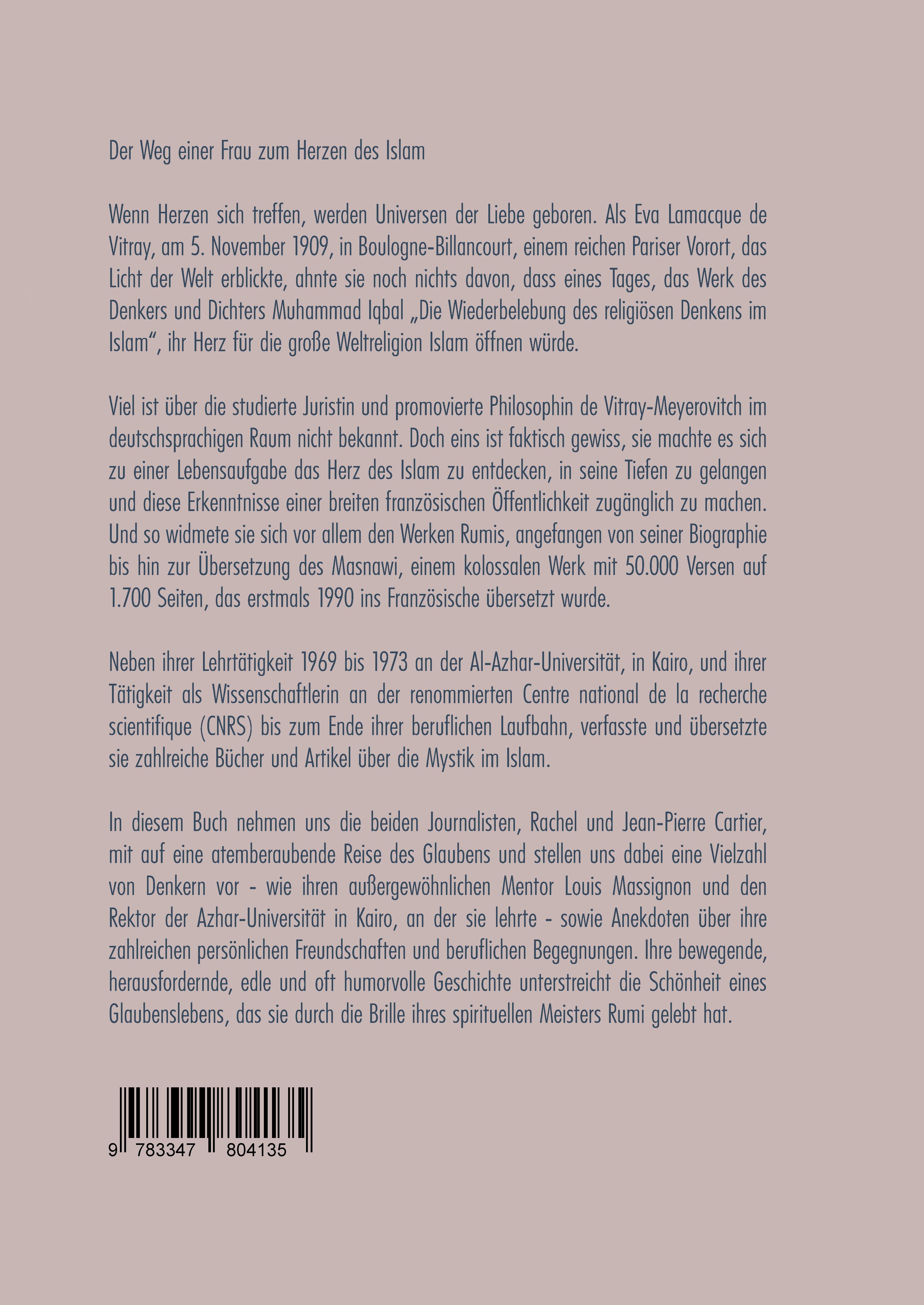 Wenn Herzen sich treffen, werden Universen der Liebe geboren. Als Eva Lamacque de Vitray, am 5. November 1909, in Boulogne-Billancourt, einem reichen Pariser Vorort, das Licht der Welt erblickte, ahnte sie noch nichts davon, dass eines Tages, das Werk des Denkers und Dichters Muhammad Iqbal "Die Wiederbelebung des religiösen Denkens im Islam", ihr Herz für die große Weltreligion Islam öffnen würde.Viel ist über die studierte Juristin und promovierte Philosophin de Vitray-Meyerovitch im deutschsprachigen Raum nicht bekannt. Doch eins ist faktisch gewiss, sie machte es sich zu einer Lebensaufgabe das Herz des Islam zu entdecken, in seine Tiefen zu gelangen und diese Erkenntnisse einer breiten französischen Öffentlichkeit zugänglich zu machen.Und so widmete sie sich vor allem den Werken Rumis, angefangen von seiner Biographie bis hin zur Übersetzung des Masnawi, einem kolossalen Werk mit 50.000 Versen auf 1.700 Seiten, das erstmals 1990 ins Französische übersetzt wurde.Neben ihrer Lehrtätigkeit 1969 bis 1973 an der Al-Azhar-Universität, in Kairo, und ihrer Tätigkeit als Wissenschaftlerin an der renommierten Centre national de la recherche scientifique (CNRS) bis zum Ende ihrer beruflichen Laufbahn, verfasste und übersetzte sie zahlreiche Bücher und Artikel über die Mystik im Islam.In diesem Buch nehmen uns die beiden Journalisten, Rachel und Jean-Pierre Cartier, mit auf eine atemberaubende Reise des Glaubens und stellen uns dabei eine Vielzahl von Denkern vor - wie ihren außergewöhnlichen Mentor Louis Massignon und den Rektor der Azhar-Universität in Kairo, an der sie lehrte - sowie Anekdoten über ihre zahlreichen persönlichen Freundschaften und beruflichen Begegnungen. Ihre bewegende, herausfordernde, edle und oft humorvolle Geschichte unterstreicht die Schönheit eines Glaubenslebens, das sie durch die Brille ihres spirituellen Meisters Rumi gelebt hat.