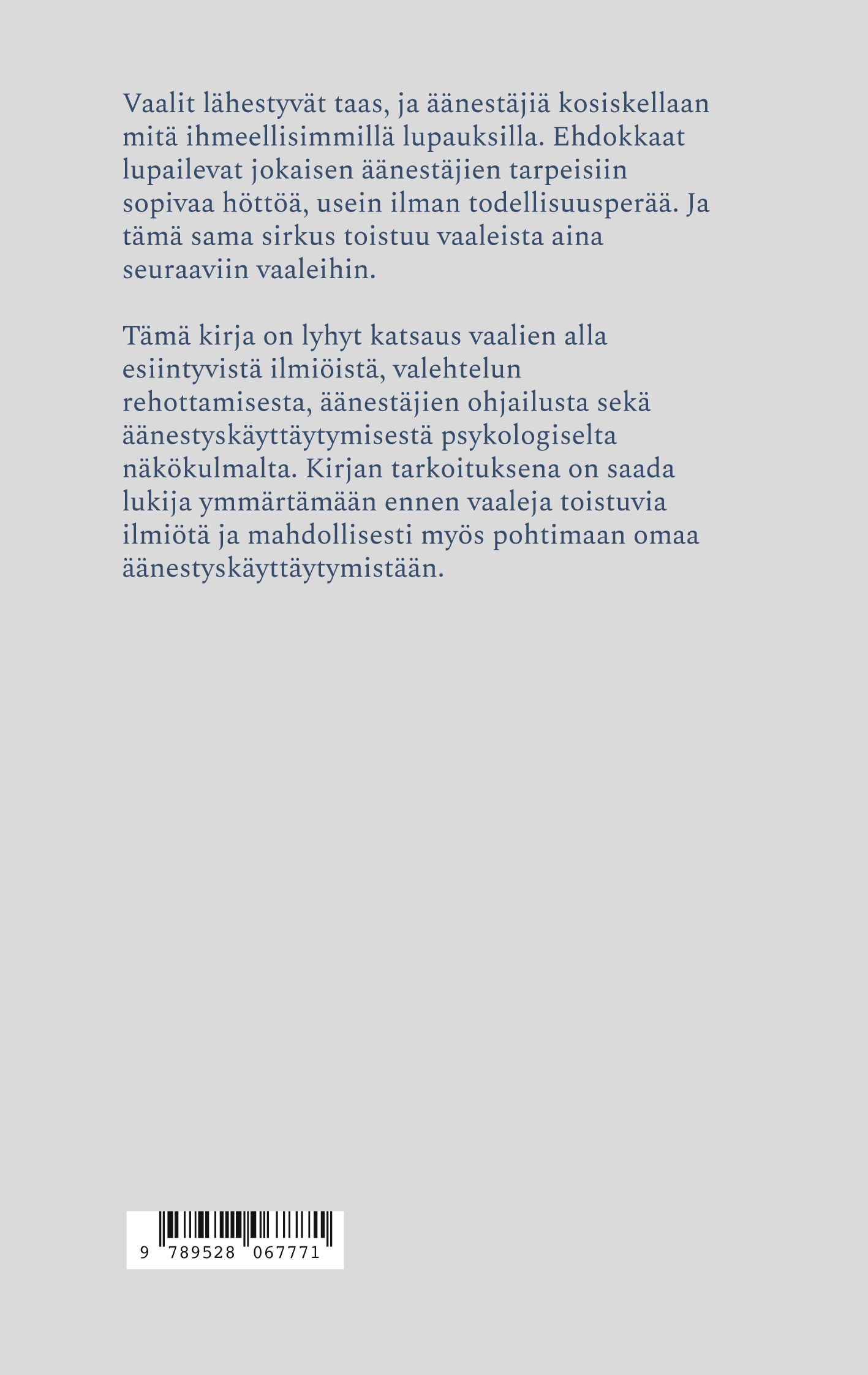 Tämä kirja on lyhyt katsaus vaalien alla esiintyvistä ilmiöistä, valehtelun rehottamisesta, äänestäjien ohjailusta sekä äänestyskäyttäytymisestä psykologiselta näkökulmalta. Kirjan tarkoituksena on saada lukija ymmärtämään ennen vaaleja toistuvia ilmiötä ja mahdollisesti myös pohtimaan omaa äänestyskäyttäytymistään.