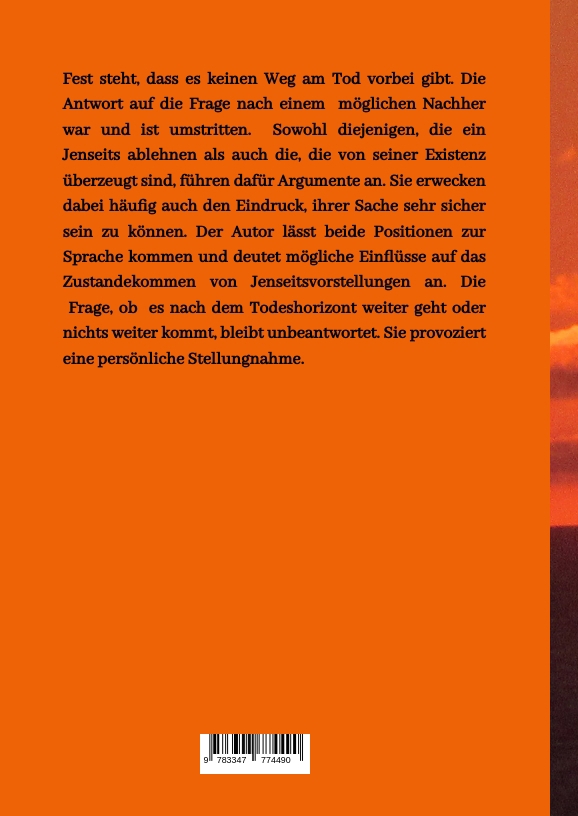 Fest steht, dass es keinen Weg am Tod vorbei gibt. Die Antwort auf die Frage nach einem möglichen Nachher war und ist umstritten. Sowohl diejenigen, die ein Jenseits ablehnen als auch die, die von seiner Existenz überzeugt sind, führen dafür Argumente an. Sie erwecken dabei häufig auch den Eindruck, ihrer Sache sehr sicher sein zu können. Der Autor lässt beide Positionen zur Sprache kommen und deutet mögliche Einflüsse auf das Zustandekommen von Jenseitsvorstellungen an. Die Frage, ob es nach dem Todeshorizont weiter geht oder nichts weiter kommt, bleibt unbeantwortet. Sie provoziert eine persönliche Stellungnahme.