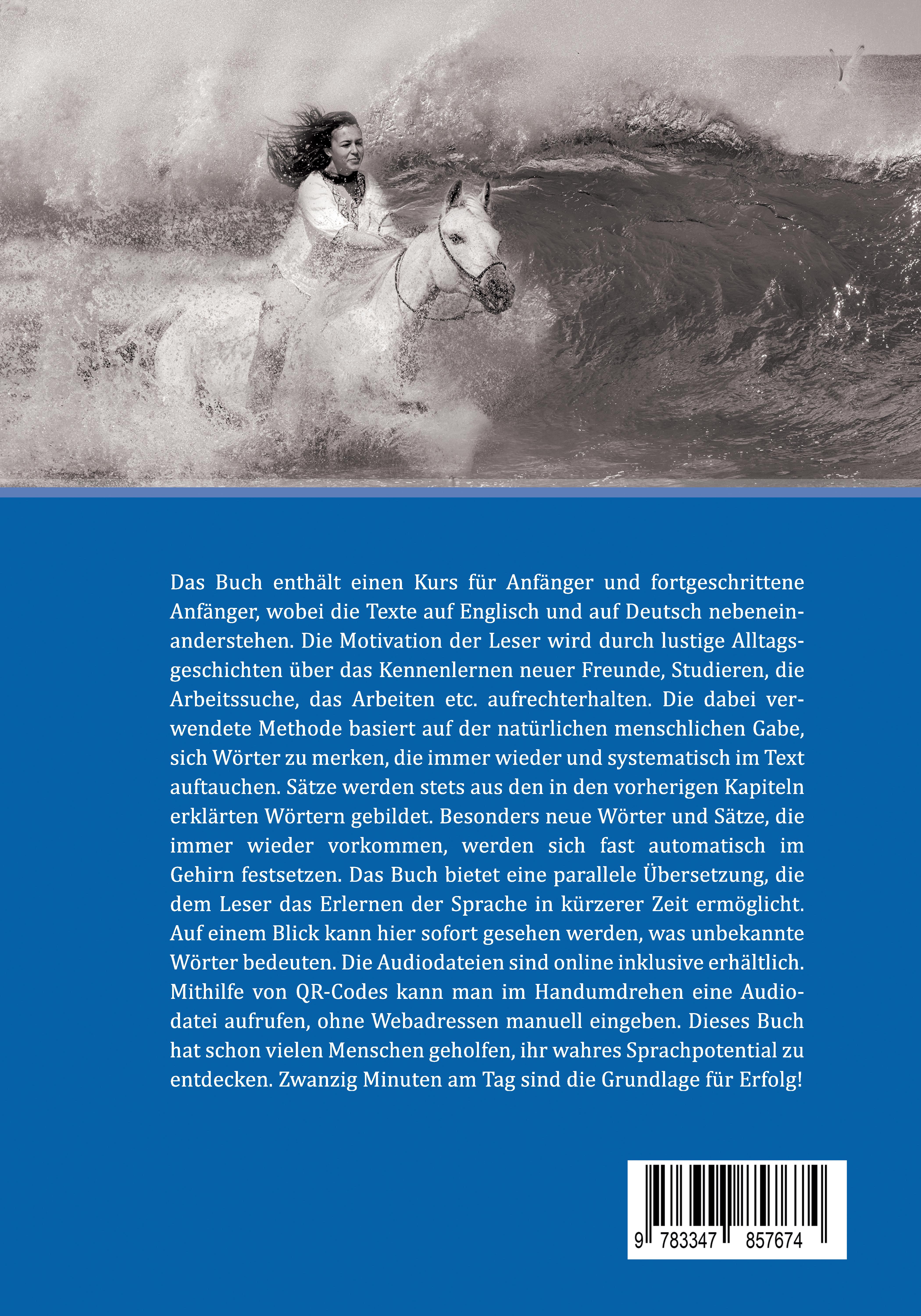 Das Buch enthält einen Kurs für Anfänger und fortgeschrittene Anfänger, wobei die Texte auf Englisch und auf Deutsch nebeneinanderstehen. Die Motivation der Leser wird durch lustige Alltagsgeschichten über das Kennenlernen neuer Freunde, Studieren, die Arbeitssuche, das Arbeiten etc. aufrechterhalten. Die dabei verwendete Methode basiert auf der natürlichen menschlichen Gabe, sich Wörter zu merken, die immer wieder und systematisch im Text auftauchen. Sätze werden stets aus den in den vorherigen Kapiteln erklärten Wörtern gebildet. Besonders neue Wörter und Sätze, die immer wieder vorkommen, werden sich fast automatisch im Gehirn festsetzen. Das Buch bietet eine parallele Übersetzung, die dem Leser das Erlernen der Sprache in kürzerer Zeit ermöglicht. Auf einem Blick kann hier sofort gesehen werden, was unbekannte Wörter bedeuten. Die Audiodateien sind online inklusive erhältlich. Mithilfe von QR-Codes kann man im Handumdrehen eine Audiodatei aufrufen, ohne Webadressen manuell eingeben. Dieses Buch hat schon vielen Menschen geholfen, ihr wahres Sprachpotential zu entdecken. Zwanzig Minuten am Tag sind die Grundlage für Erfolg!