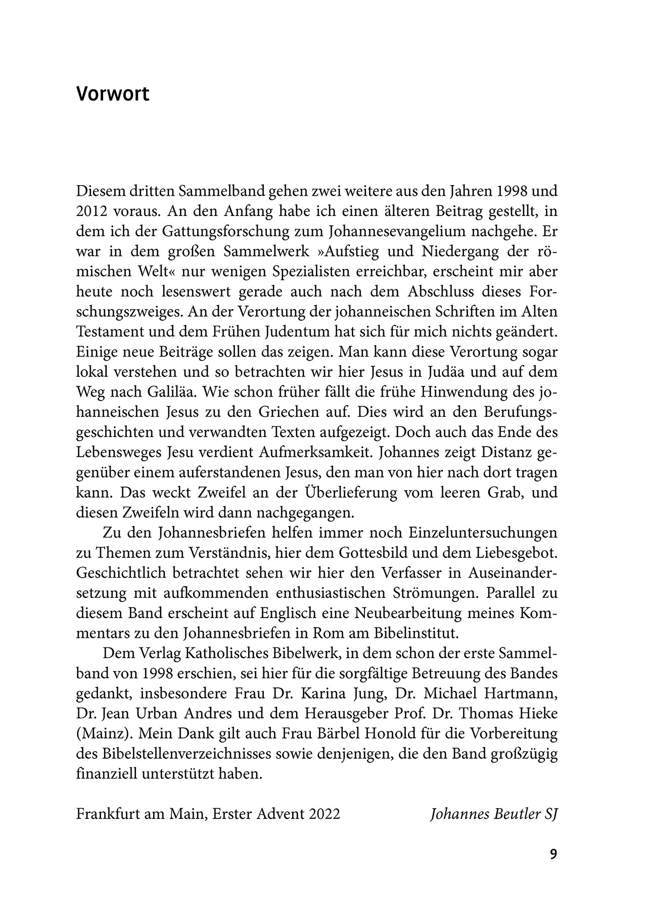 An zwei Sammelbände aus den Jahren 1998 und 2012 schließt sich ein dritter mit Aufsätzen zumeist aus den Jahren 2012 bis 2022 zu den johanneischen Schriften an. Erneut zeigen sich hier die Wurzeln der johanneischen Schriften im Alten Testament und im Frühen Judentum. Gott ist für den Vierten Evangelisten zunächst der Gott Israels, der sich dann auch als der Vater Jesu erweist. Die ersten Berufungsgeschichten zeigen die Hinwendung des johanneischen Christentums zur Welt der Griechen. In den Johannesbriefen steht der Verfasser in der Auseinandersetzung mit aufkommenden enthusiastischen Strömungen.