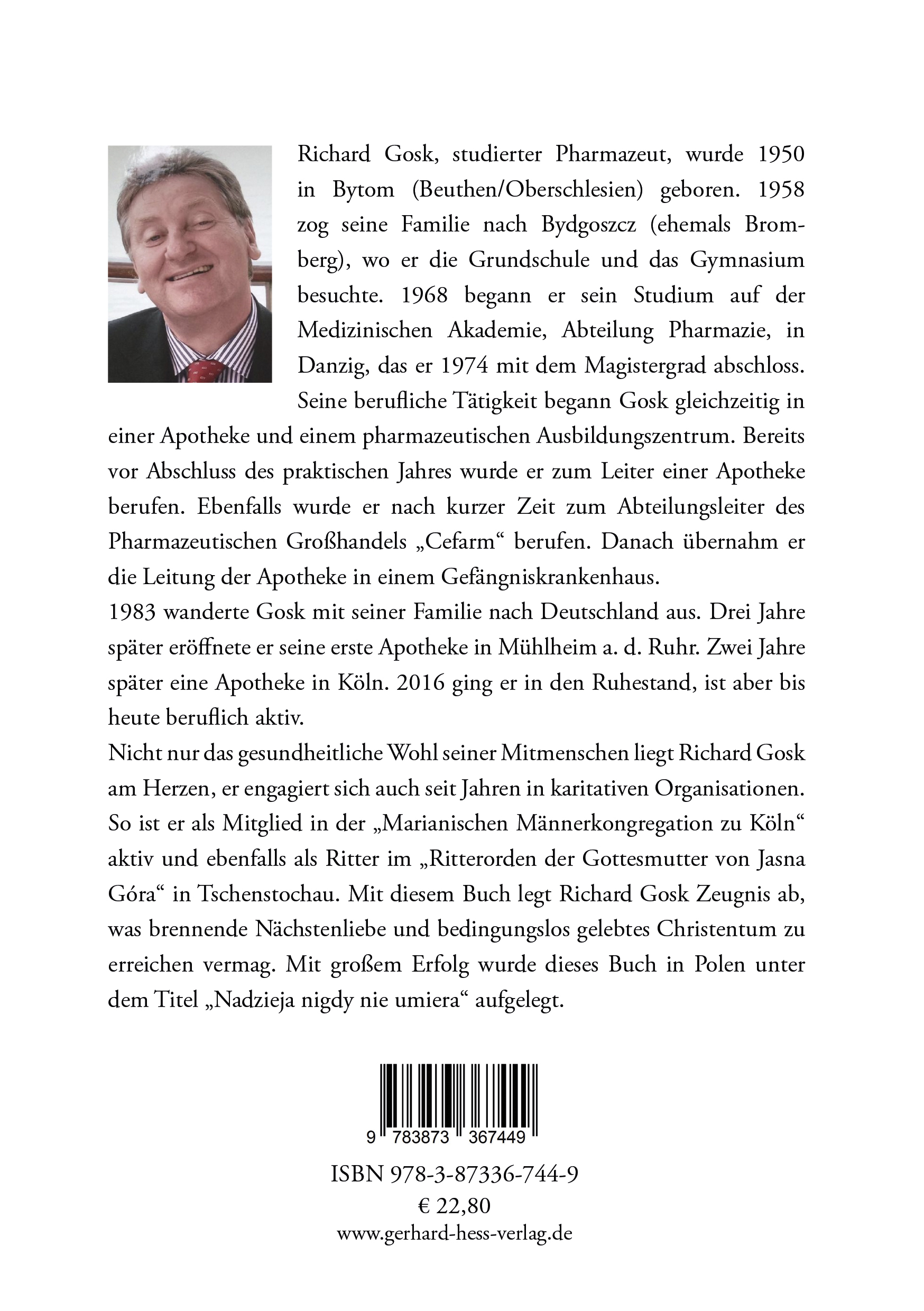 Richard Gosk, studierter Pharmazeut, wurde 1950 in Bytom (Beuthen/Oberschlesien) geboren. 1958 zog seine Familie nach Bydgoszcz (ehemals Bromberg), wo er die Grundschule und das Gymnasium besuchte. 1968 begann er sein Studium auf der Medizinischen Akademie, Abteilung Pharmazie, in Danzig, das er 1974 mit dem Magistergrad abschloss. Seine berufliche Tätigkeit begann Gosk gleichzeitig in einer Apotheke und einem pharmazeutischen Ausbildungszentrum. Bereits vor Abschluss des praktischen Jahres wurde er zum Leiter einer Apotheke berufen. Ebenfalls wurde er nach kurzer Zeit zum Abteilungsleiter des Pharmazeutischen Großhandels "Cefarm" berufen. Danach übernahm er die Leitung der Apotheke in einem Gefängniskrankenhaus. 1983 wanderte Gosk mit seiner Familie nach Deutschland aus. Drei Jahre später eröffnete er seine erste Apotheke in Mühlheim a. d. Ruhr. Zwei Jahre später eine Apotheke in Köln. 2016 ging er in den Ruhestand, ist aber bis heute beruflich aktiv. Nicht nur das gesundheitliche Wohl seiner Mitmenschen liegt Richard Gosk am Herzen, er engagiert sich auch seit Jahren in karitativen Organisationen. So ist er als Mitglied in der "Marianischen Männerkongregation zu Köln" aktiv und ebenfalls als Ritter im "Ritterorden der Gottesmutter von Jasna Góra" in Tschenstochau. Mit diesem Buch legt Richard Gosk Zeugnis ab, was brennende Nächstenliebe und bedingungslos gelebtes Christentum zu erreichen vermag. Mit großem Erfolg wurde dieses Buch in Polen unter dem Titel "Nadzieja nigdy nie umiera" aufgelegt.