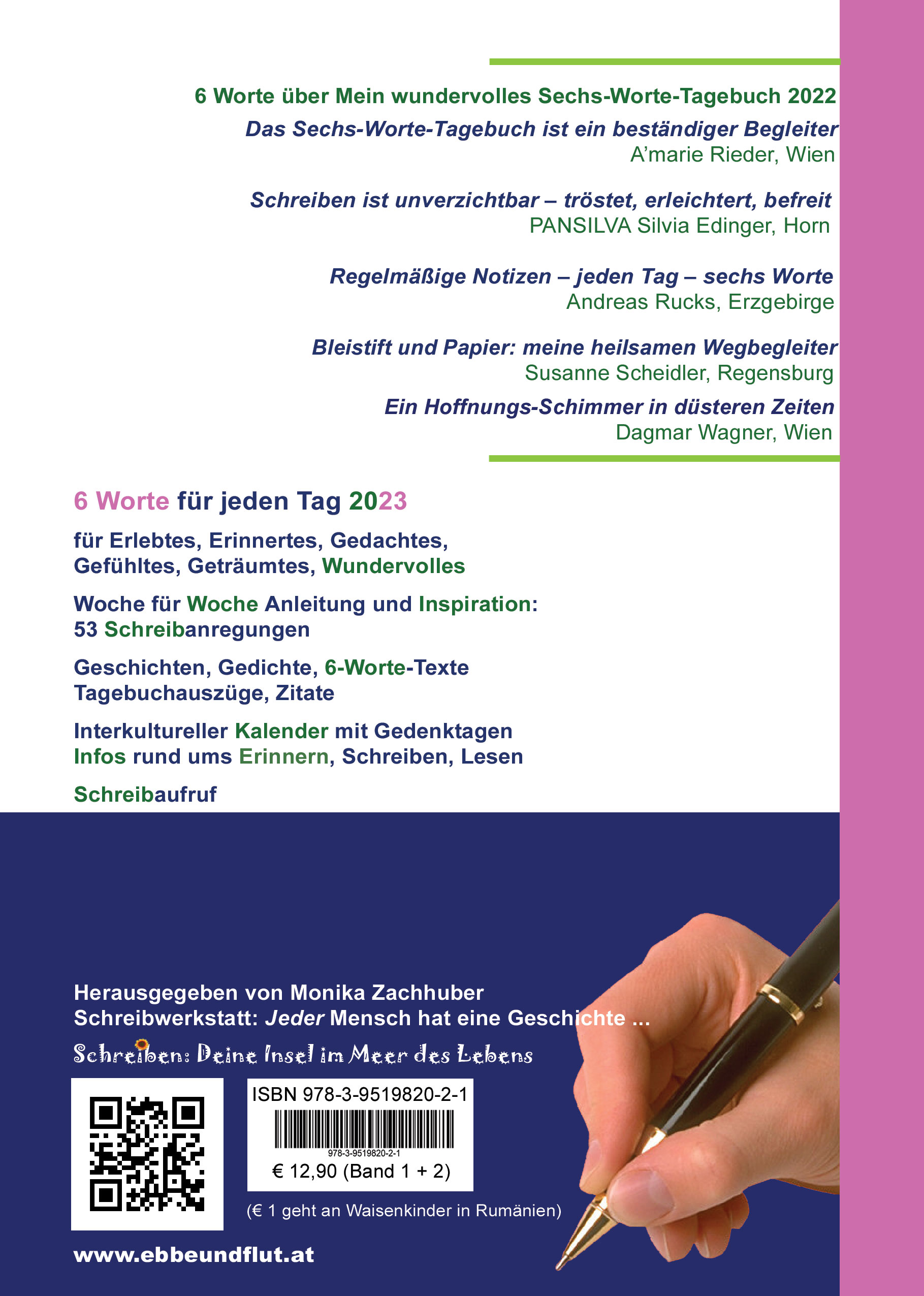 Sechs Worte für jeden Tag 2023: für Erlebtes, Erinnertes, Gedachtes, Gefühltes, Geträumtes, Wundervolles. Mit Erinnerungstexten (Sechs Worte und mehr: Prosa und Lyrik) von Schreibaufrufteilnehmenden und 52 Schreibanregungen durchs Jahr.