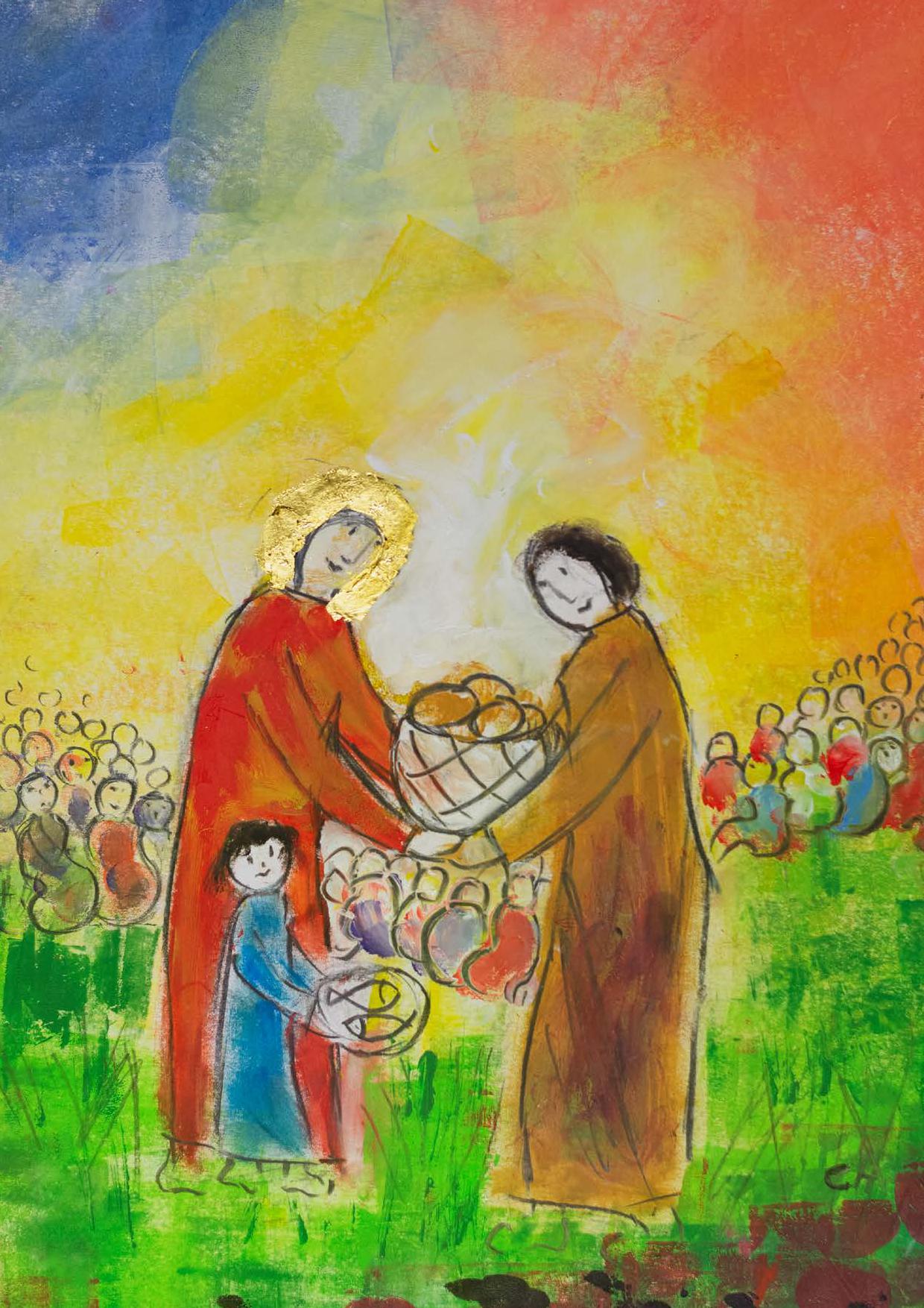 Diese Bildermappe umfasst 8 Bilder: Ich habe ein Zuhause, Herr, wo wohnst du?, Die Sonne leuchtet, Jesus ist das Licht der Welt, Ein Laib Brot, Jesus teilt das Brot, Jesus trägt das Kreuz, Der Friede sei mit euch!