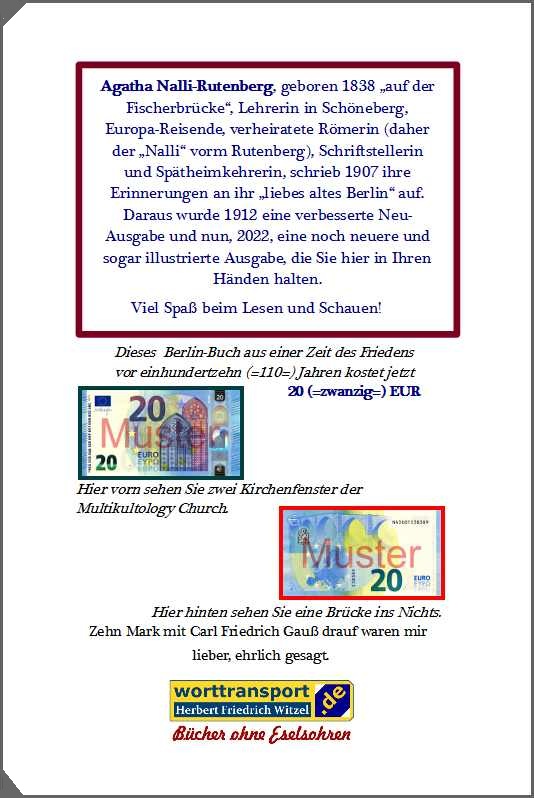 Agatha Nalli-Rutenberg (1838-1919) veröffentlichte 1907 ihre Erinnerungen unter dem Titel: "Mein liebes altes Berlin". Die zweite erweiterte Ausgabe von 1912 erschien unter dem Namen "Das Alte Berlin". Herbert Friedrich Witzel traf in seiner A&O-Reihe ("Aufgefrischter Originaltext") eine Textauswahl, ersetzte die alte Fraktur durch eine moderne Antiqua-Schrift und bereicherte seine Broschüre durch Illustrationen. Die Autorin erzählt anschaulich aus ihrer Kindheit, hebt ihre sportlichen Betätigungen hervor und beschreibt die Vergnügungen der Berliner. Ein großer Abschnitt ist den Sagen und Spukhäusern der Stadt gewidmet. Hauptberuflich arbeitete die Autorin als Lehrerin in Schöneberg. Eine Erzählung in systematischer Reihenfolge strebte sie nicht an. Die liebenswerten Plaudereien gleichen vielmehr einem wundersamen Kaleidoskop. Unser früherer Vereinsvorsitzender Ernst Friedel schrieb damals in seinem Geleitwort: "Alles in allem ein fesselndes, erheiterndes, belehrendes Werk, dem Leserkreis beiderlei Geschlechts bestens empfohlen."