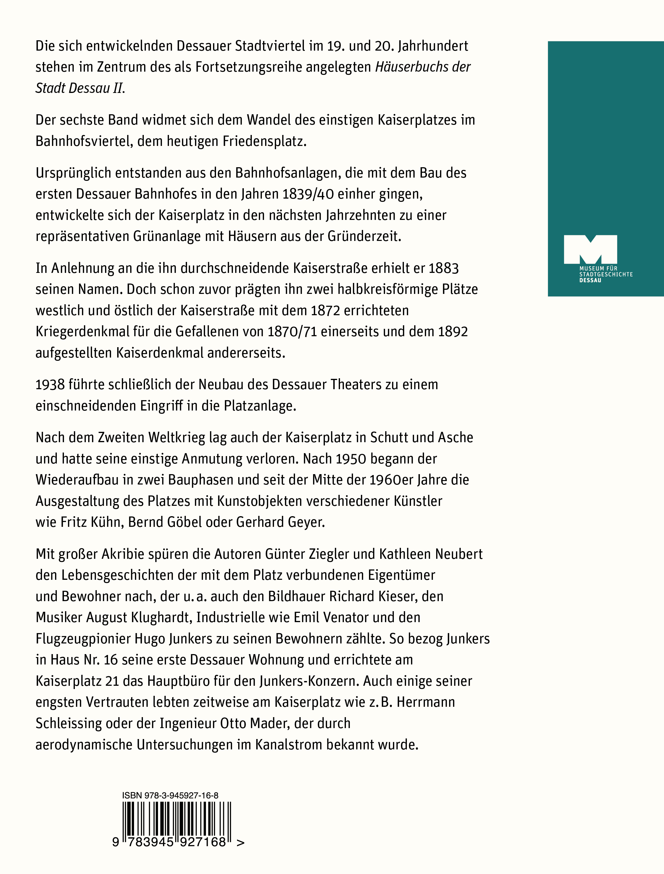 Mit großer Akribie spüren die Autoren Günter Ziegler und Kathleen Neubert den Lebensgeschichten der mit dem Platz verbundenen Eigentümer und Bewohner nach, der u. a. auch den Bildhauer Richard Kieser, den Musiker August Klughardt, Industrielle wie Emil Venator und den Flugzeugpionier Hugo Junkers zu seinen Bewohnern zählte. So bezog Junkers in Haus Nr. 16 seine erste Dessauer Wohnung und errichtete am Kaiserplatz 21 das Hauptbüro für den Junkers-Konzern. Auch einige seiner engsten Vertrauten lebten zeitweise am Kaiserplatz wie z. B. Herrmann Schleissing oder der Ingenieur Otto Mader, der durch aerodynamische Untersuchungen im Kanalstrom bekannt wurde.