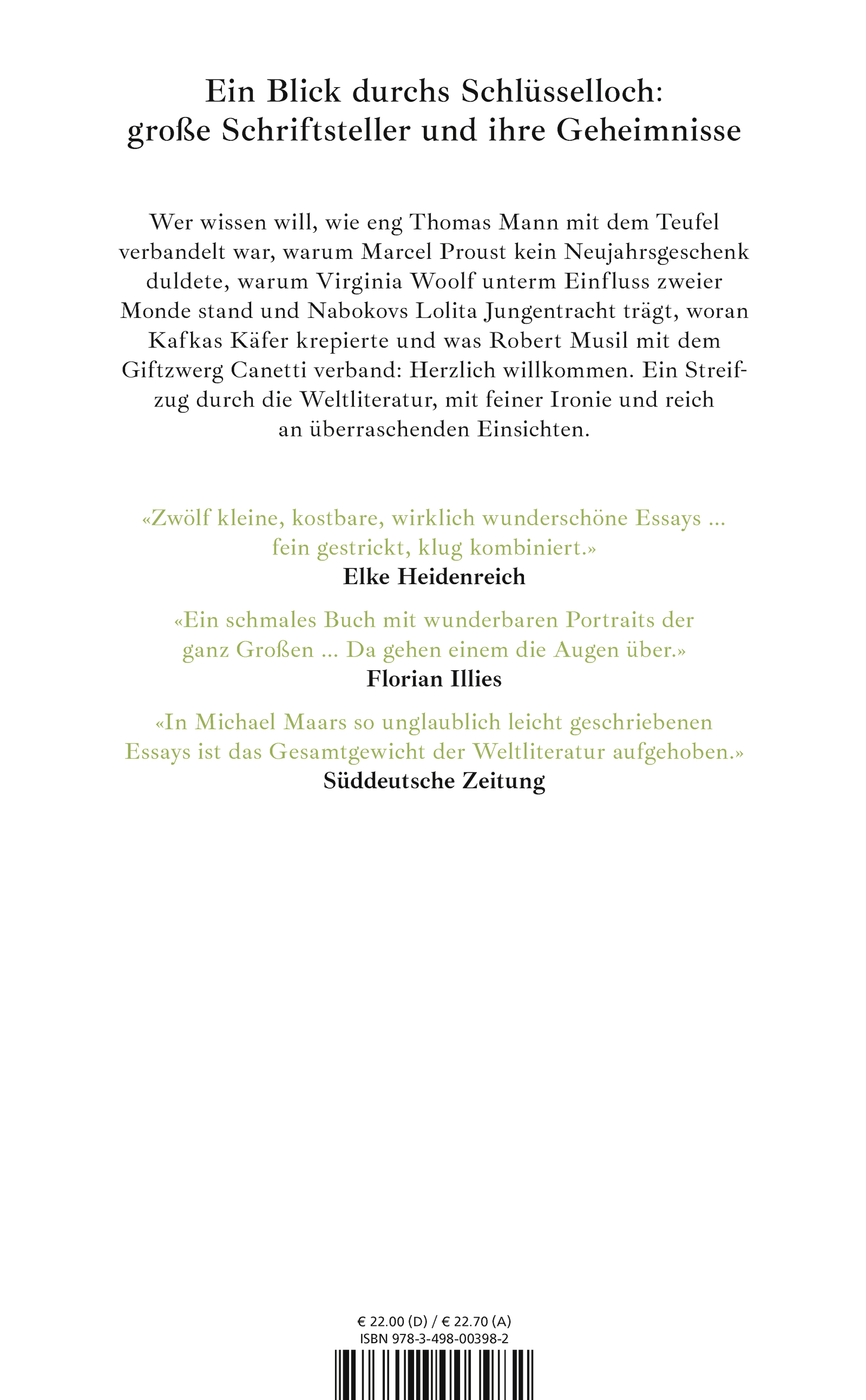 Jedes große Werk der Literatur birgt Rätsel und Geheimnisse, und nicht selten findet sich der Schlüssel zur Lösung genau an jenem Punkt, an dem sich Leben und Schreiben ihrer Schöpfer berühren. In zwölf meisterhaften Portraits, von Hans Christian Andersen bis hin zu Jorge Luis Borges, spürt der Literaturkritiker und Bestsellerautor Michael Maar diese sensiblen Punkte auf – und stößt dort auf ganz Unerwartetes, manchmal Erheiterndes, aber ebenso auf innere Spannungen und Abgründe. Was bedeutete es für diese Schriftsteller, die allesamt auch Getriebene waren, wenn, wie es bei Kafka so bild- wie rätselhaft heißt, «die Leoparden in den Tempel einbrechen und die Opferkrüge leer saufen»? Wer wissen will, wie eng Thomas Mann mit dem Teufel verbandelt war, warum Marcel Proust kein Neujahrsgeschenk duldete, warum Virginia Woolf unterm Einfluss zweier Monde stand und Nabokovs Lolita Jungentracht trägt, woran Kafkas Käfer krepierte und was Robert Musil mit dem Giftzwerg Canetti verband: Herzlich willkommen.