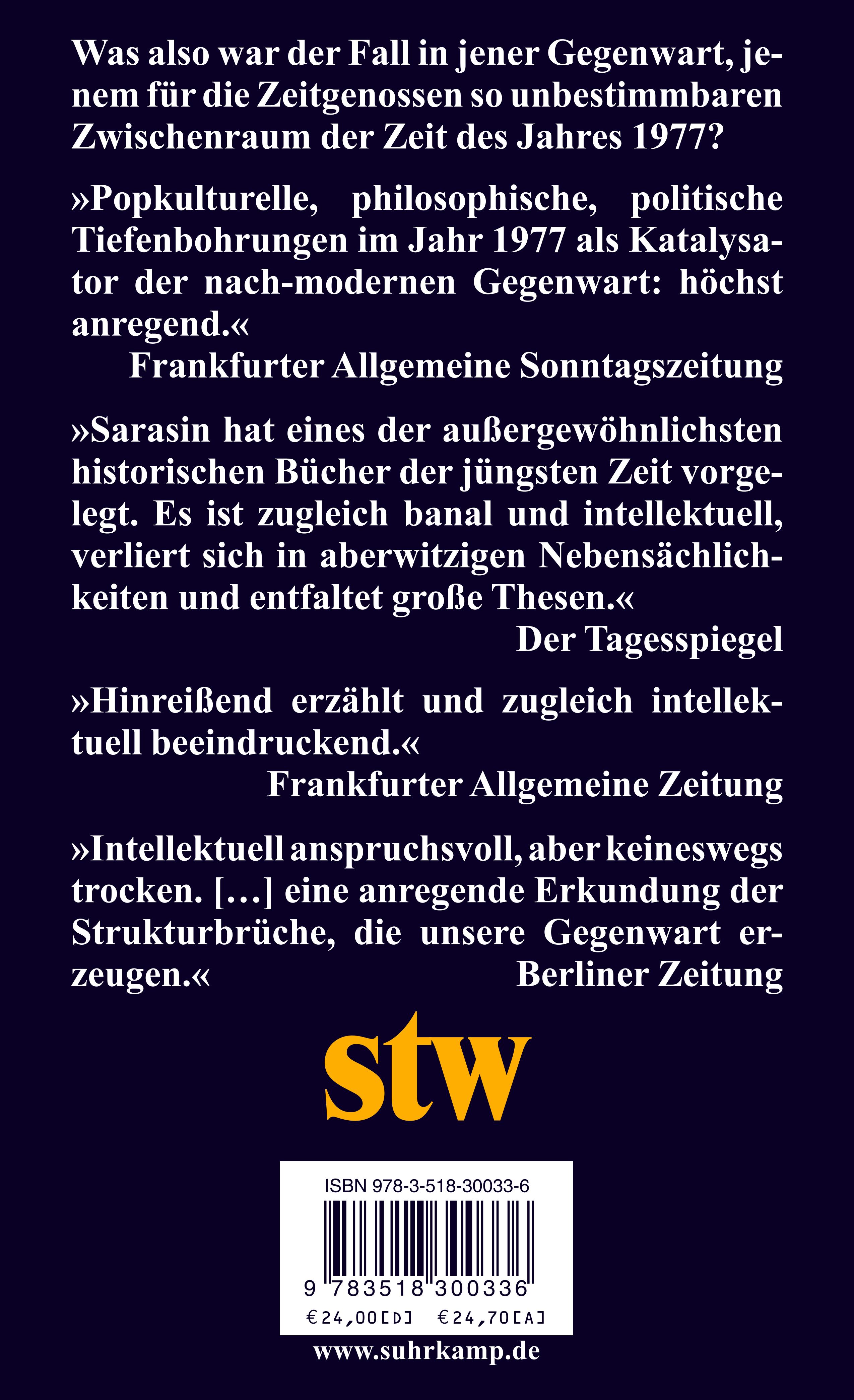 »Philipp Sarasins 1977. Eine kurze Geschichte der Gegenwart entfaltet eine Sogwirkung. Hineingezogen wird man in den Strudel der Ereignisse dieses Schlüsseljahres, ja der Siebziger insgesamt.« Andreas Reckwitz Süddeutsche Zeitung 20211229