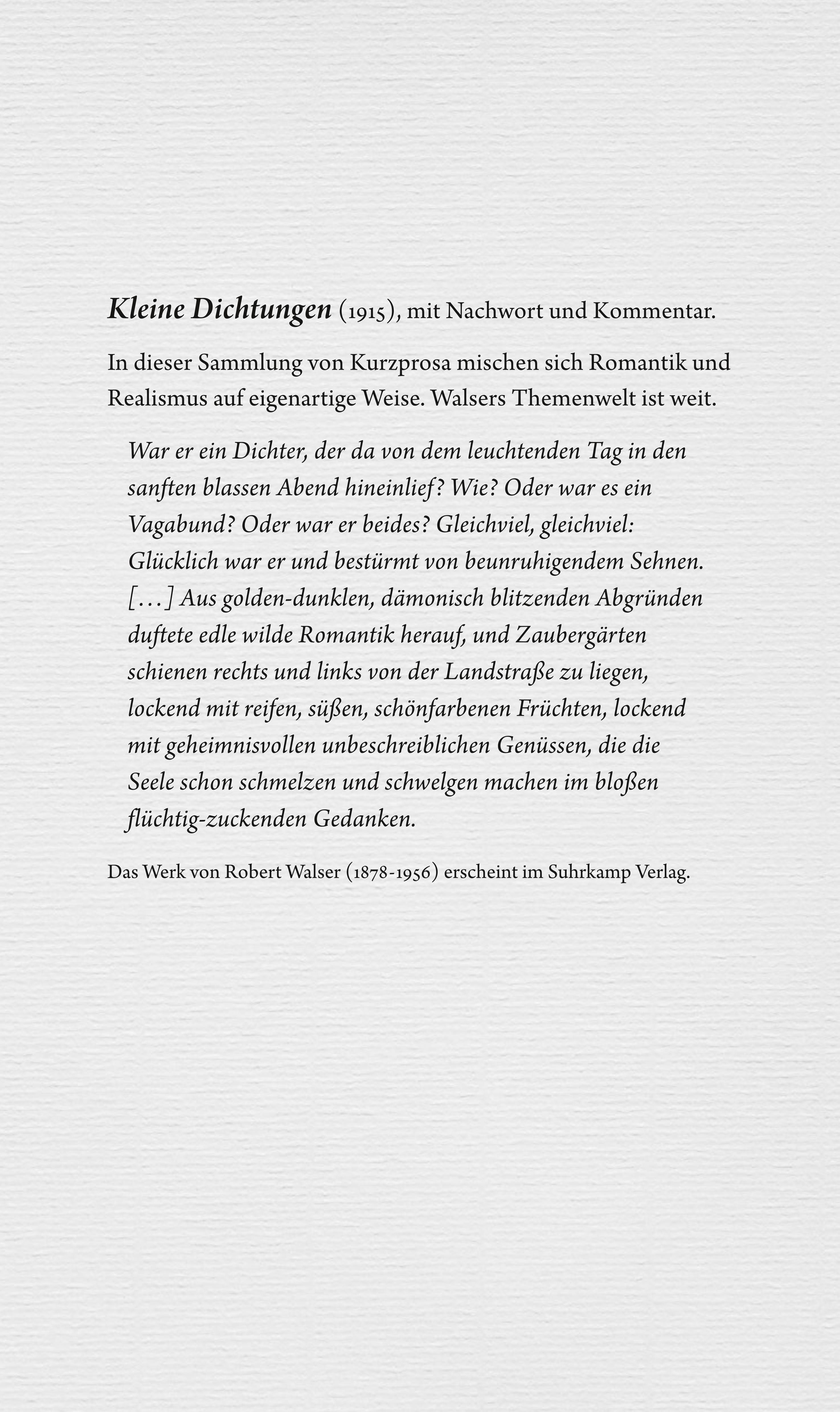 In Robert Walsers Berliner und Bieler Jahren entstanden diese Kleinen Dichtungen (1914); diese Sammlung Prosaminiaturen zeigt einen bunten Querschnitt durch Walsers Themenwelt: literarische Porträts, Traumerzählungen, Wanderungen und Spaziergänge, Wälder und Schneelandschaften, Mondschein- und Wolkenfantasien - aber auch Wirtshausbesuche, Verbrechen und Unfälle. Stilistisch mischen sich Romantik und Realismus auf eigenartige Weise. - Das Nachwort bringt uns Walsers ambivalentes Verhältnis zur Romantik näher.
