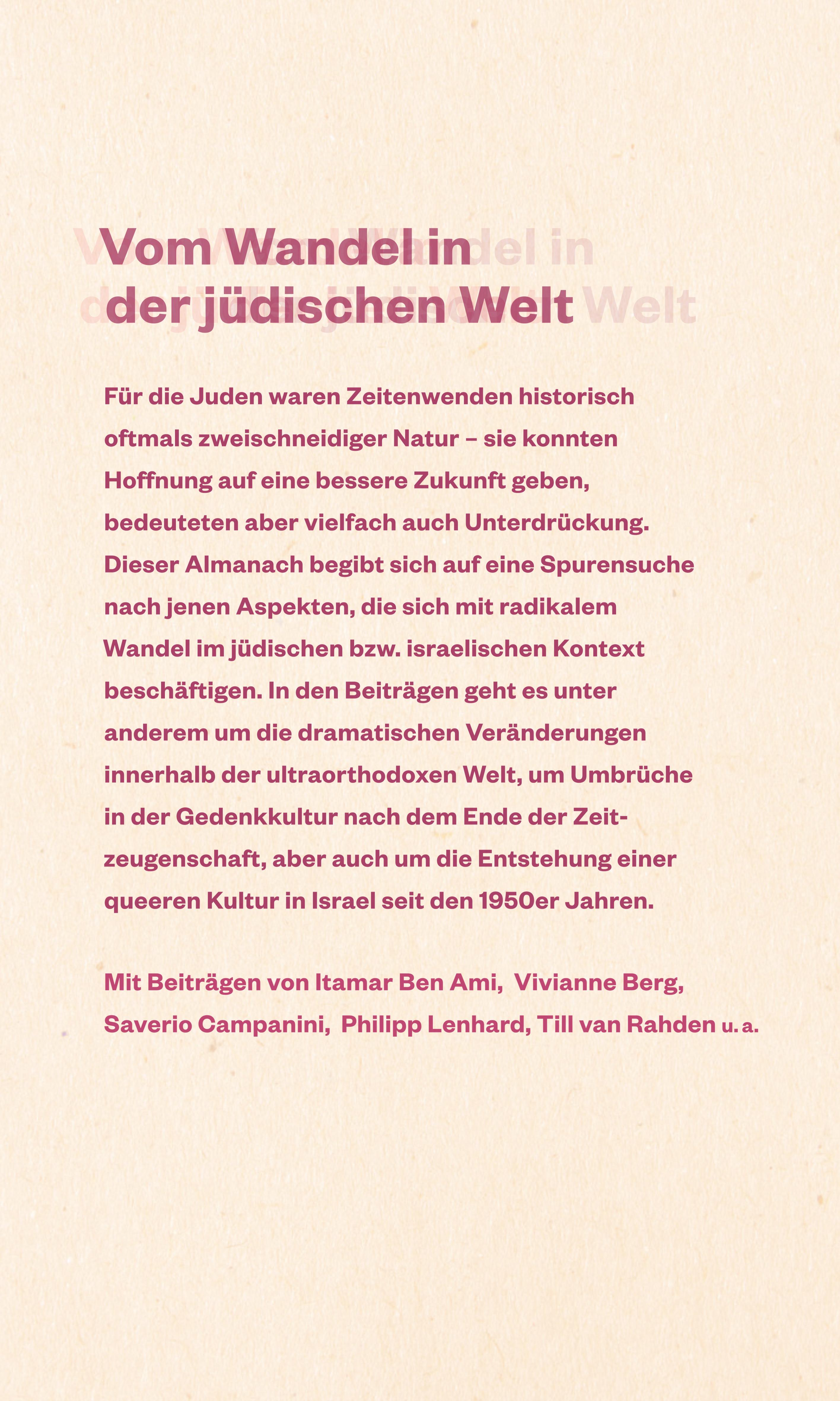 Dieser Almanach begibt sich auf eine Spurensuche nach jenen Aspekten, die sich mit radikalem Wandel im jüdischen bzw. israelischen Kontext beschäftigen. In den Beiträgen wird unter anderem die talmudische Herkunft des hebräischen Begriffes für Krise beschrieben sowie der Übergang des Hebräischen von einer heiligen zur säkularen Sprache. Darüber hinaus geht es um die dramatischen Veränderungen innerhalb der ultraorthodoxen Welt, um Umbrüche in der Gedenkkultur nach dem Ende der Zeitzeugenschaft oder den veränderten Umgang mit Humor und Religion nach den Anschlägen auf Charlie Hebdo in Paris, aber auch um die Entstehung einer queeren Kultur in Israel seit den 1950er Jahren.