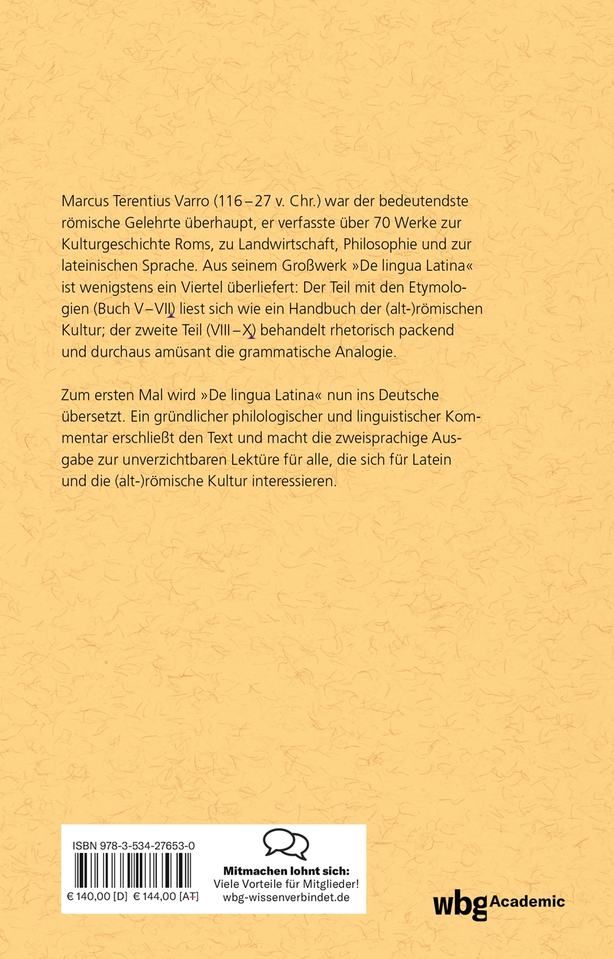 Marcus Terentius Varro (116-27 v. Chr.) war der bedeutendste römische Gelehrte überhaupt. Seiner Produktivität kam kein anderer Römer gleich; er verfasste über 70 Werke zur Kulturgeschichte Roms, zu Landwirtschaft, Philosophie und zur lateinischen Sprache. In der Spätantike war er durch sein enorm breites Werk eine unerschöpfliche Fundgrube für kulturhistorische Erkenntnisse. Aus seinem Großwerk "De lingua Latina" ist wenigstens ein Viertel überliefert: Der Teil mit den Etymologien (Buch V-VII) liest sich wie ein Handbuch der (alt-)römischen Kultur; der zweite Teil (VIII-X) behandelt rhetorisch packend und durchaus amüsant die grammatische Analogie. Zum ersten Mal wird "De lingua Latina" nun ins Deutsche übersetzt. An zahlreichen Stellen wurde der lateinische Text grundlegend verbessert; ein gründlicher philologischer und linguistischer Kommentar erschließt den Text und macht die zweisprachige Ausgabe zur unverzichtbaren Lektüre für alle, die sich für Latein und die (alt-)römische Kultur interessieren.