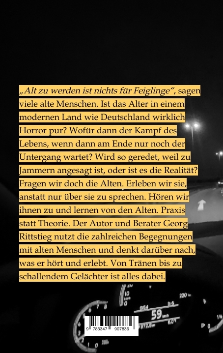 "Alt zu werden ist nichts für Feiglinge", sagen viele alte Menschen. Ist das Alter in einem modernen Land wie Deutschland wirklich Horror pur? Wofür dann der Kampf des Lebens, wenn dann am Ende nur noch der Untergang wartet? Wird so geredet, weil zu Jammern einfach angesagt ist, oder ist es die Realität? Fragen wir doch die Alten. Erleben wir sie, anstatt nur über sie zu sprechen. Hören wir ihnen zu und lernen von den Alten. Praxis statt Theorie. Der Autor und Berater Georg Rittstieg nutzt die zahlreichen Begegnungen mit alten Menschen und denkt darüber nach, was er hört und erlebt. Von Tränen bis zu schallendem Gelächter ist alles dabei.Als Leser:in kannst Du Dich einfach unterhalten lassen, hier wartet der volle Griff ins Leben auf Dich.Du kannst Dich anregen lassen, aufregen lassen und mitnehmen lassen in einen Dialog über Alter, Fürsorge, Pflege und Leben.Oder Du machst es wie der Autor: der lernt gerne von alten Menschen, wenn sie vom Leben erzählen.Nicht zuletzt möge dieses Buch auffordern zu einem offenen Dialog über das Alt werden, über den Horror "Pflege" und welche Alternativen es geben kann.
