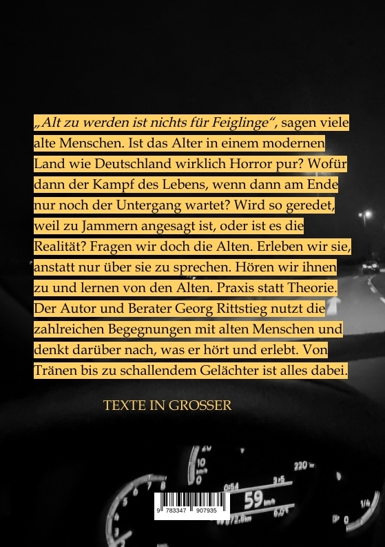 "Alt zu werden ist nichts für Feiglinge", sagen viele alte Menschen. Ist das Alter in einem modernen Land wie Deutschland wirklich Horror pur? Wofür dann der Kampf des Lebens, wenn dann am Ende nur noch der Untergang wartet? Wird so geredet, weil zu Jammern einfach angesagt ist, oder ist es die Realität? Fragen wir doch die Alten. Erleben wir sie, anstatt nur über sie zu sprechen. Hören wir ihnen zu und lernen von den Alten. Praxis statt Theorie. Der Autor und Berater Georg Rittstieg nutzt die zahlreichen Begegnungen mit alten Menschen und denkt darüber nach, was er hört und erlebt. Von Tränen bis zu schallendem Gelächter ist alles dabei.Als Leser:in kannst Du Dich einfach unterhalten lassen, hier wartet der volle Griff ins Leben auf Dich.Du kannst Dich anregen lassen, aufregen lassen und mitnehmen lassen in einen Dialog über Alter, Fürsorge, Pflege und Leben.Oder Du machst es wie der Autor: der lernt gerne von alten Menschen, wenn sie vom Leben erzählen.Nicht zuletzt möge dieses Buch auffordern zu einem offenen Dialog über das Alt werden, über den Horror "Pflege" und welche Alternativen es geben kann.