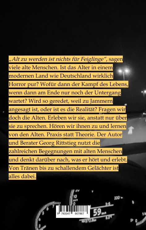 "Alt zu werden ist nichts für Feiglinge", sagen viele alte Menschen. Ist das Alter in einem modernen Land wie Deutschland wirklich Horror pur? Wofür dann der Kampf des Lebens, wenn dann am Ende nur noch der Untergang wartet? Wird so geredet, weil zu Jammern einfach angesagt ist, oder ist es die Realität? Fragen wir doch die Alten. Erleben wir sie, anstatt nur über sie zu sprechen. Hören wir ihnen zu und lernen von den Alten. Praxis statt Theorie. Der Autor und Berater Georg Rittstieg nutzt die zahlreichen Begegnungen mit alten Menschen und denkt darüber nach, was er hört und erlebt. Von Tränen bis zu schallendem Gelächter ist alles dabei.Als Leser:in kannst Du Dich einfach unterhalten lassen, hier wartet der volle Griff ins Leben auf Dich.Du kannst Dich anregen lassen, aufregen lassen und mitnehmen lassen in einen Dialog über Alter, Fürsorge, Pflege und Leben.Oder Du machst es wie der Autor: der lernt gerne von alten Menschen, wenn sie vom Leben erzählen.Nicht zuletzt möge dieses Buch auffordern zu einem offenen Dialog über das Alt werden, über den Horror "Pflege" und welche Alternativen es geben kann.