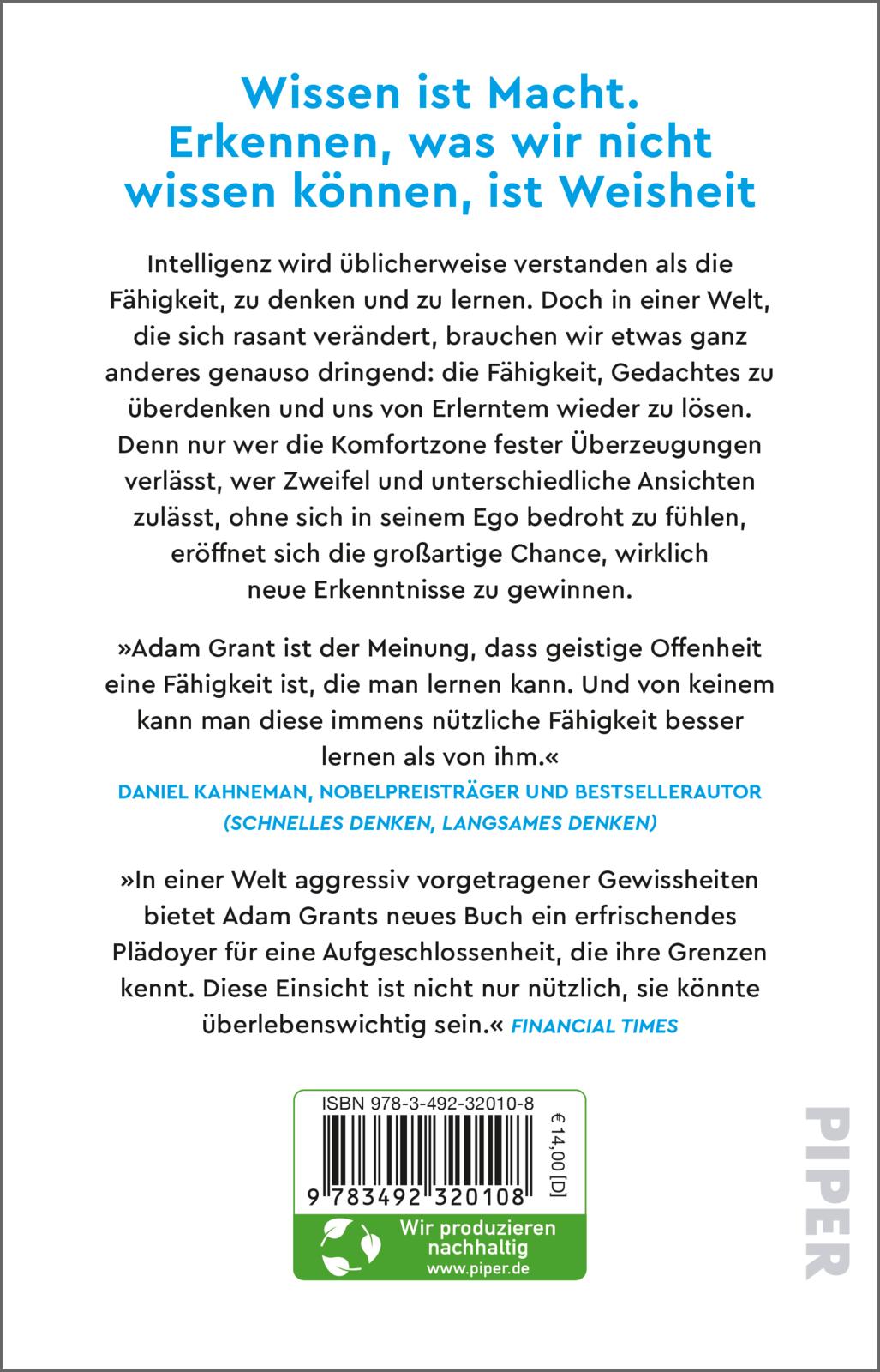 »Adam Grant ist der Meinung, dass geistige Offenheit eine Fähigkeit ist, die man lernen kann. Und von keinem kann man diese immens nützliche Fähigkeit besser lernen als von ihm. Die bemerkenswerten Einsichten seines brillanten Buches werden dazu führen, dass Sie Ihre Ansichten und Ihre wichtigsten Entscheidungen überdenken. Garantiert.«