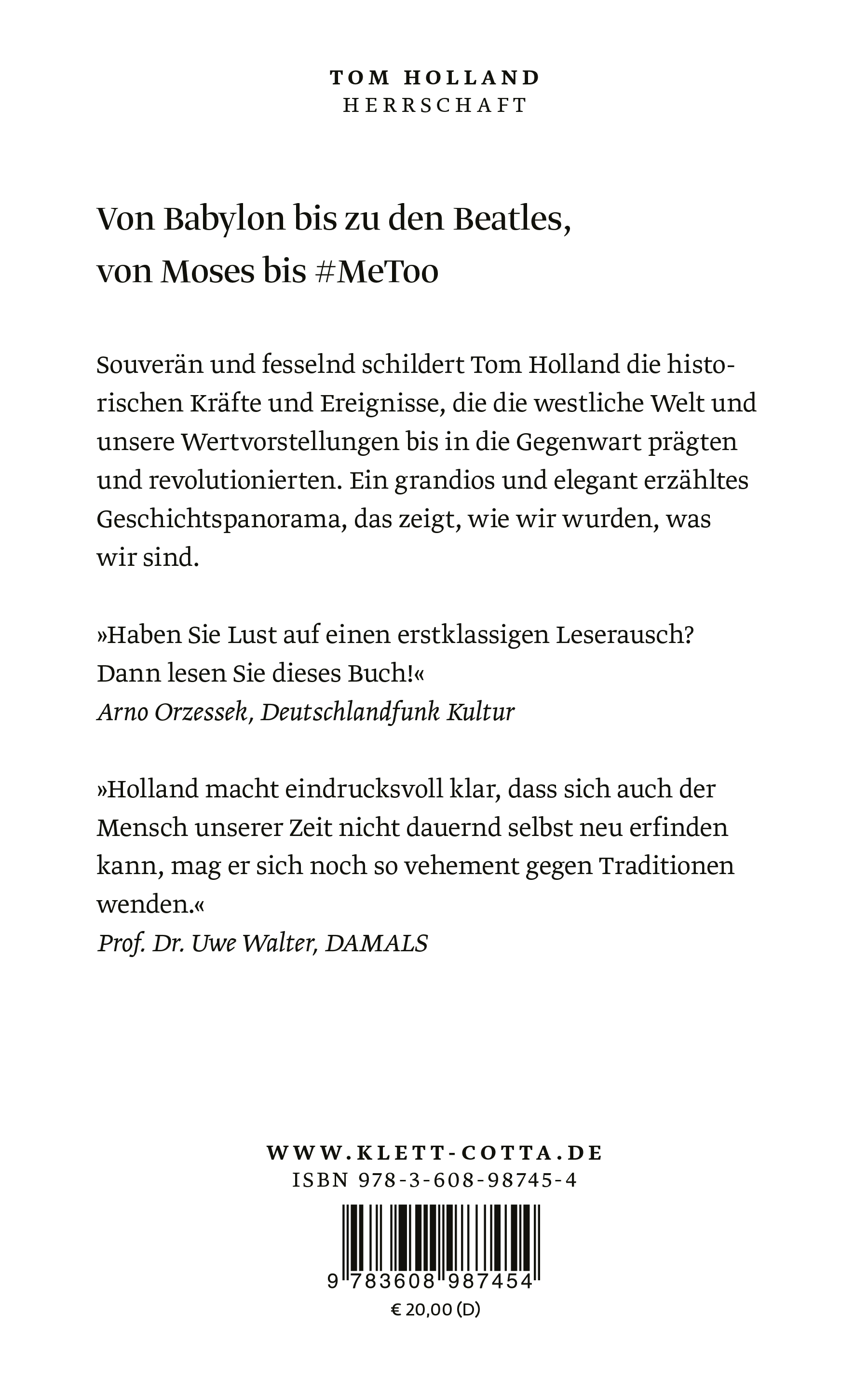 »Tom Holland hat einen opulent instrumentierten historiografischen Blockbuster geschrieben. [...] Es geht um eine Totale, eine Selbsterklärung dieses Westens. [...] Ein neues Kapitel im fruchtbaren Austausch zwischen Historiografie und schöner Literatur.« Gustav Seibt, Süddeutsche Zeitung, 04. Mai 2021 Gustav Seibt Süddeutsche Zeitung 20210504