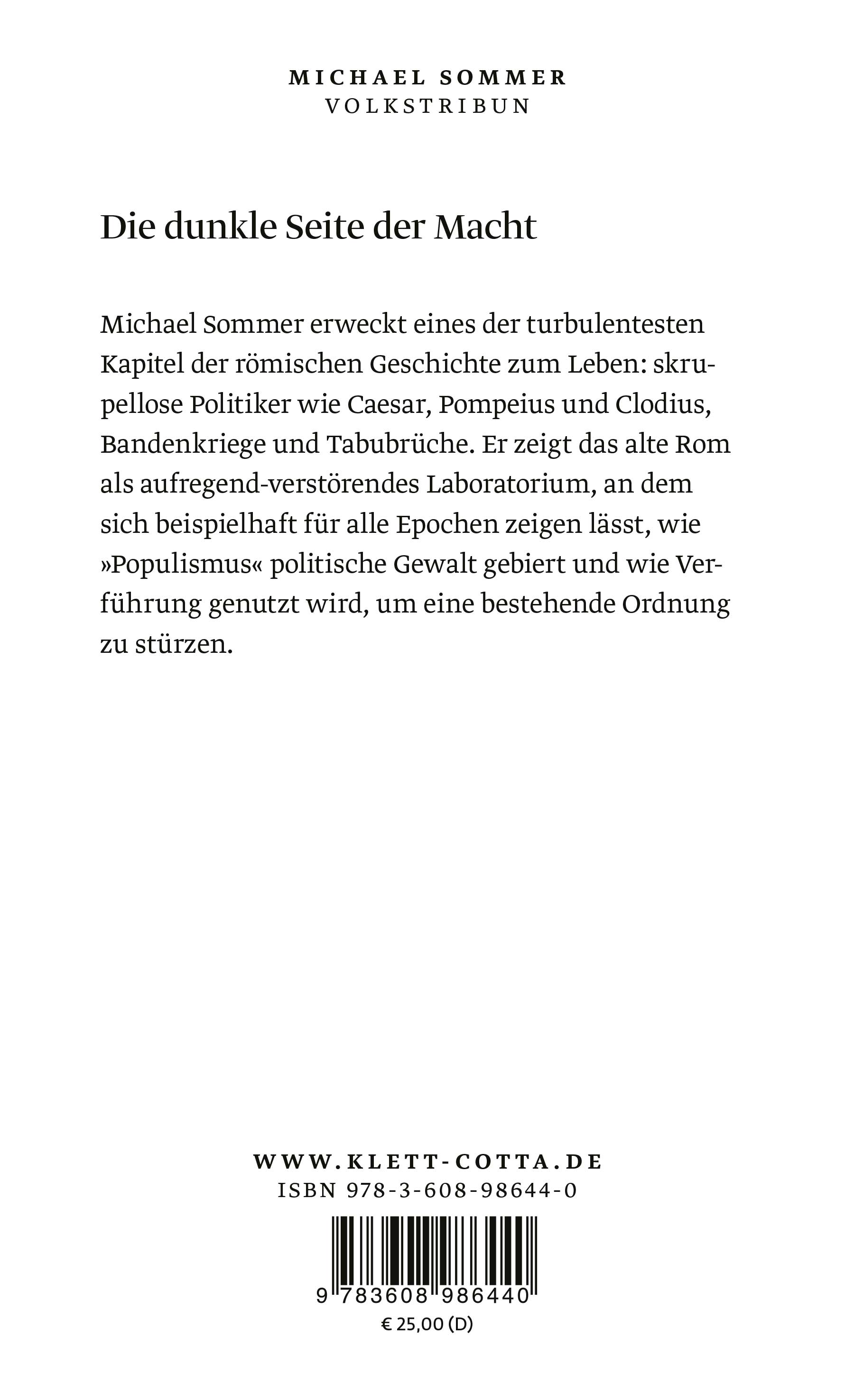 Doch Clodius agierte stets auch auf eigene Faust: Als Bandenführer mit unbändiger Energie und dem Vorsatz, seinen Willen gegen alle Regeln der Republik durchzusetzen, schrieb Clodius die Signatur der Epoche, die eine zeitlose Warnung an uns alle enthält: Zahlen sich Gewalt und die Verführung der Massen aus?
