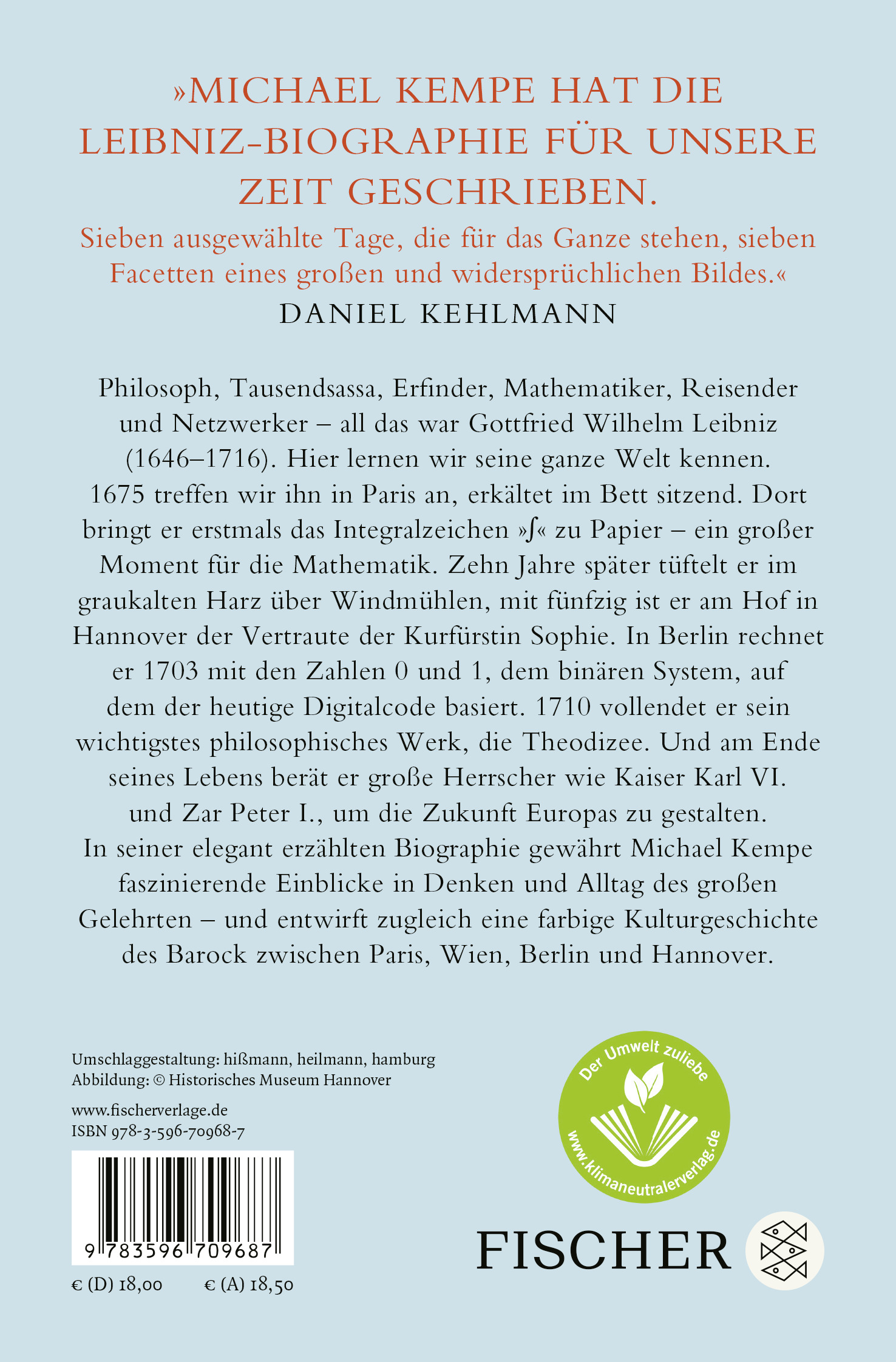 Elegant erzählt der Historiker und Leibniz-Kenner Michael Kempe von sieben Tagen in Leibniz' übervollem Leben. Sieben Tage in sieben verschiedenen Jahren, an denen Leibniz' Leben und Werk eine neue Wendung nehmen. 1675 treffen wir ihn in Paris an, wo er morgens im Bett sitzt und arbeitet, umgeben von einem Berg an Notizzetteln - an diesem Tag bringt er erstmals das Integralzeichen »_« zu Papier. Es ist ein großer Moment in der Mathematik - und ein zeitlebens währender Streit mit Isaac Newton und dessen Anhängern. In Hannover plaudert Leibniz 1696 am Hof mit der Kurfürstin Sophie über den Trost in der Philosophie. Sein wohl größter Wurf aber ist die Skizze einer Maschine, die mit den Zahlen 0 und 1 rechnet - Grundlage des Digitalcodes und damit des Computers.