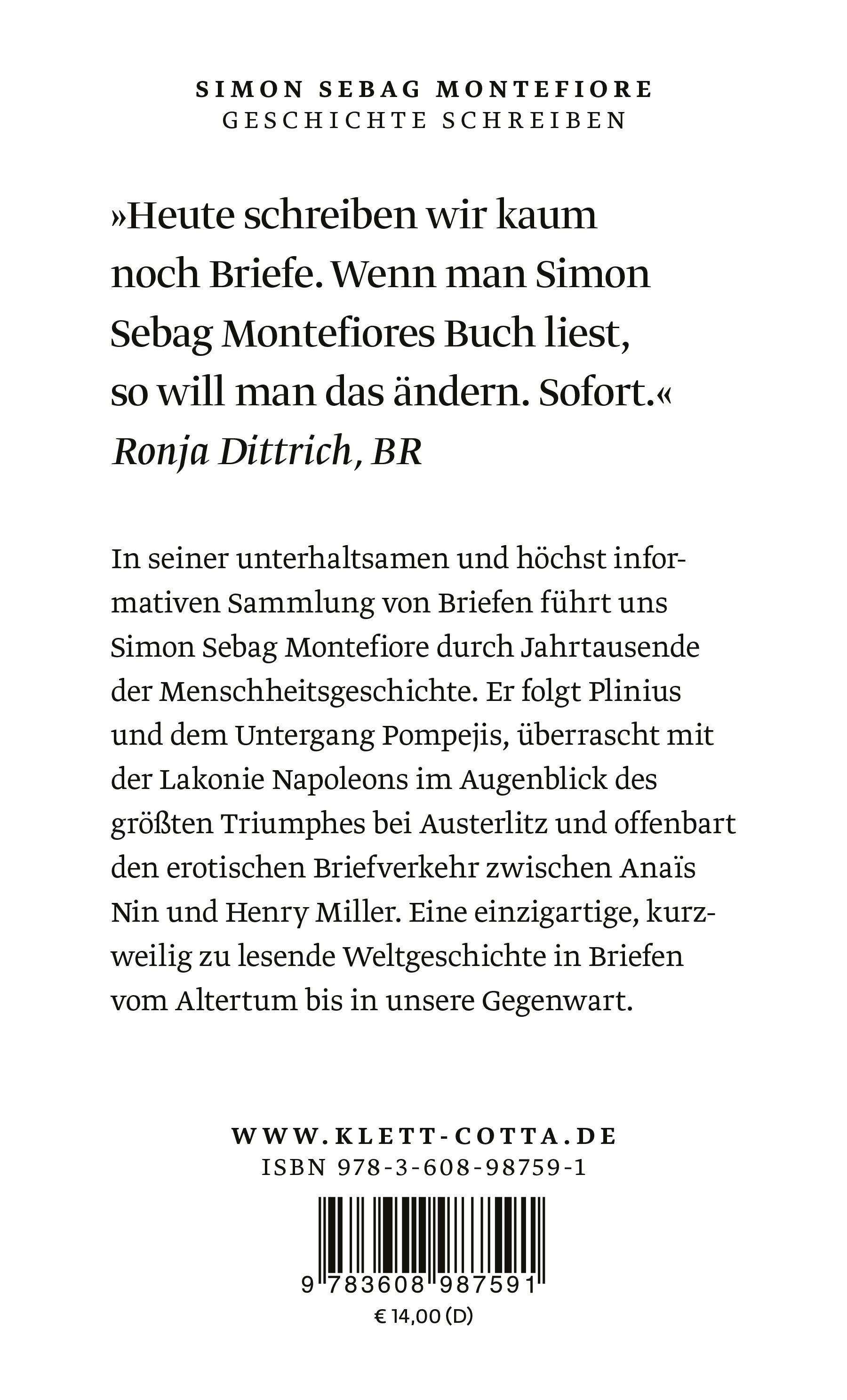 | Schlagworte | Augustus • berühmte Briefeschreiber • Bismarck • Briefe • Briefe schreiben • Briefkultur • Flaubert • Friedrich der Große • Geschichte • Geschichte in Briefen • Hitler • Kafka • Katharina die Große • Korrespondenz • Marcus Antonius • Napoleon • Oktavian • Picasso • potemkin • Stalin • taschenbuch Sachbuch • Tschechow • Voltaire • Zola |