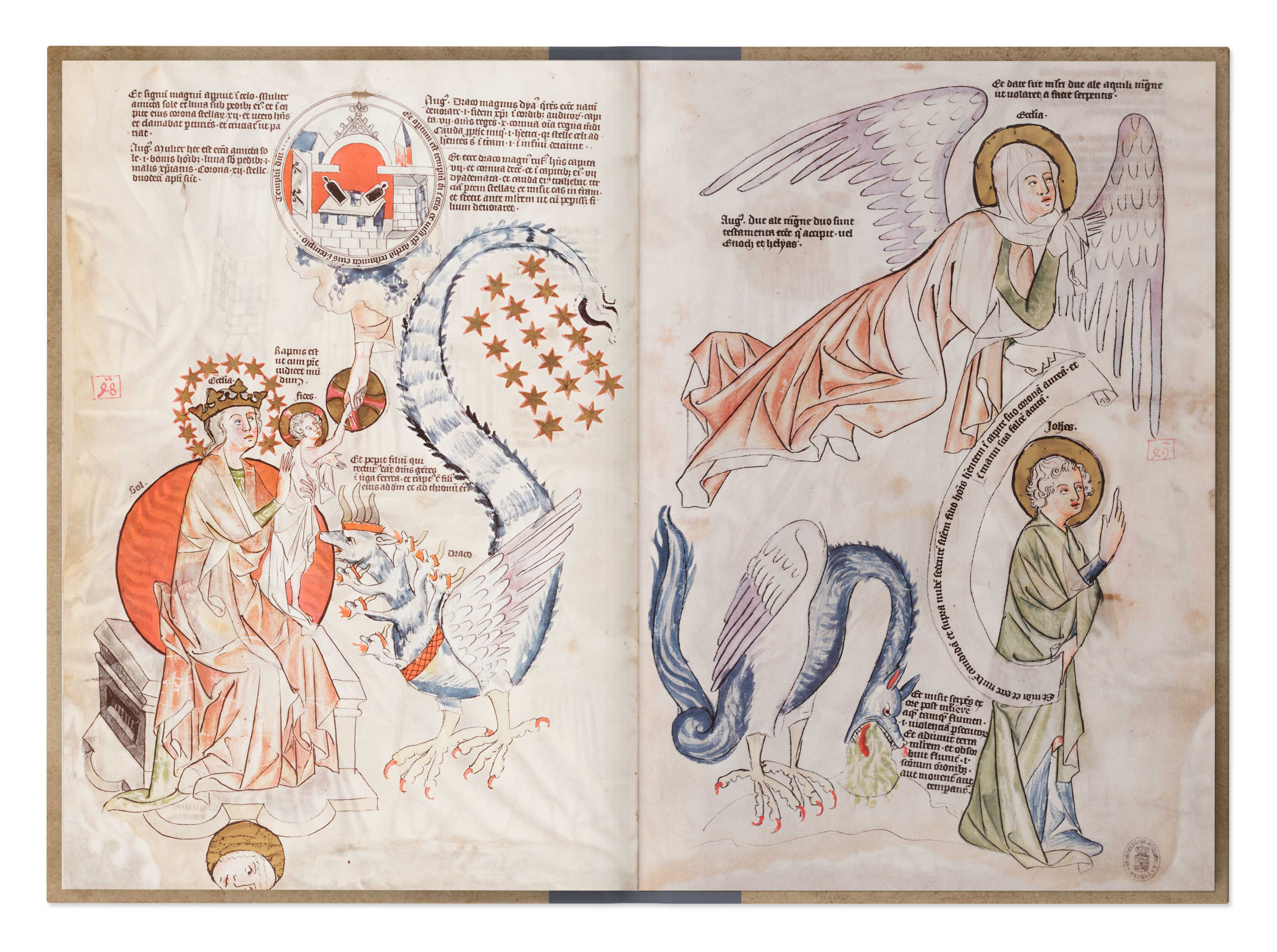 Dieses faszinierende Exemplar der Buchkunst zeigt - eine Ausnahme unter den ca. achtzig bekannten sogenannten Bilder- oder Armenbibeln - die Offenbarung des Johannes vom Jüngsten Gericht. Neben dem Evangelisten selbst beim Verfassen des biblischen Textes als zentrales Element, zeigt die Biblia Pauperum ein breites Spektrum an faszinierenden Bildern: Feuer speiende Drachen, Engel und Dämonen, Ritter, mehrköpfige Wesen und schließlich Gott als Erlöser und Retter.
