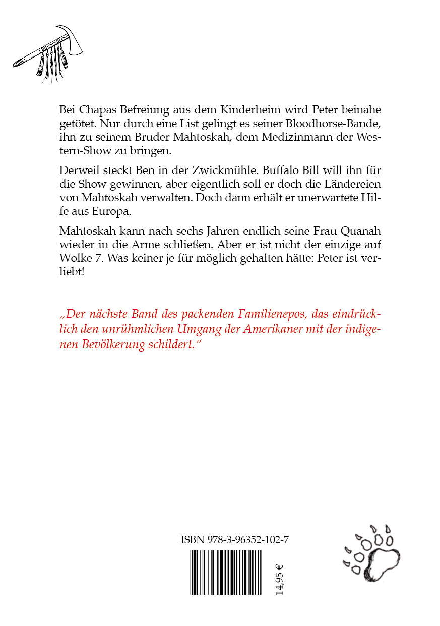 Bei Chapas Befreiung aus dem Kinderheim wird Peter beinahe getötet. Nur durch eine List gelingt es seiner Bloodhorse-Bande, ihn zu seinem Bruder Mahtoskah, dem Medizinmann der Western-Show zu bringen.Derweil steckt Ben in der Zwickmühle. Buffalo Bill will ihn für die Show gewinnen, aber eigentlich soll er doch die Ländereien von Mahtoskah verwalten. Doch dann erhält er unerwartete Hilfe aus Europa.Mahtoskah kann nach sechs Jahren endlich seine Frau Quanah wieder in die Arme schließen. Aber er ist nicht der einzige auf Wolke 7. Was keiner je für möglich gehalten hätte: Peter ist verliebt!