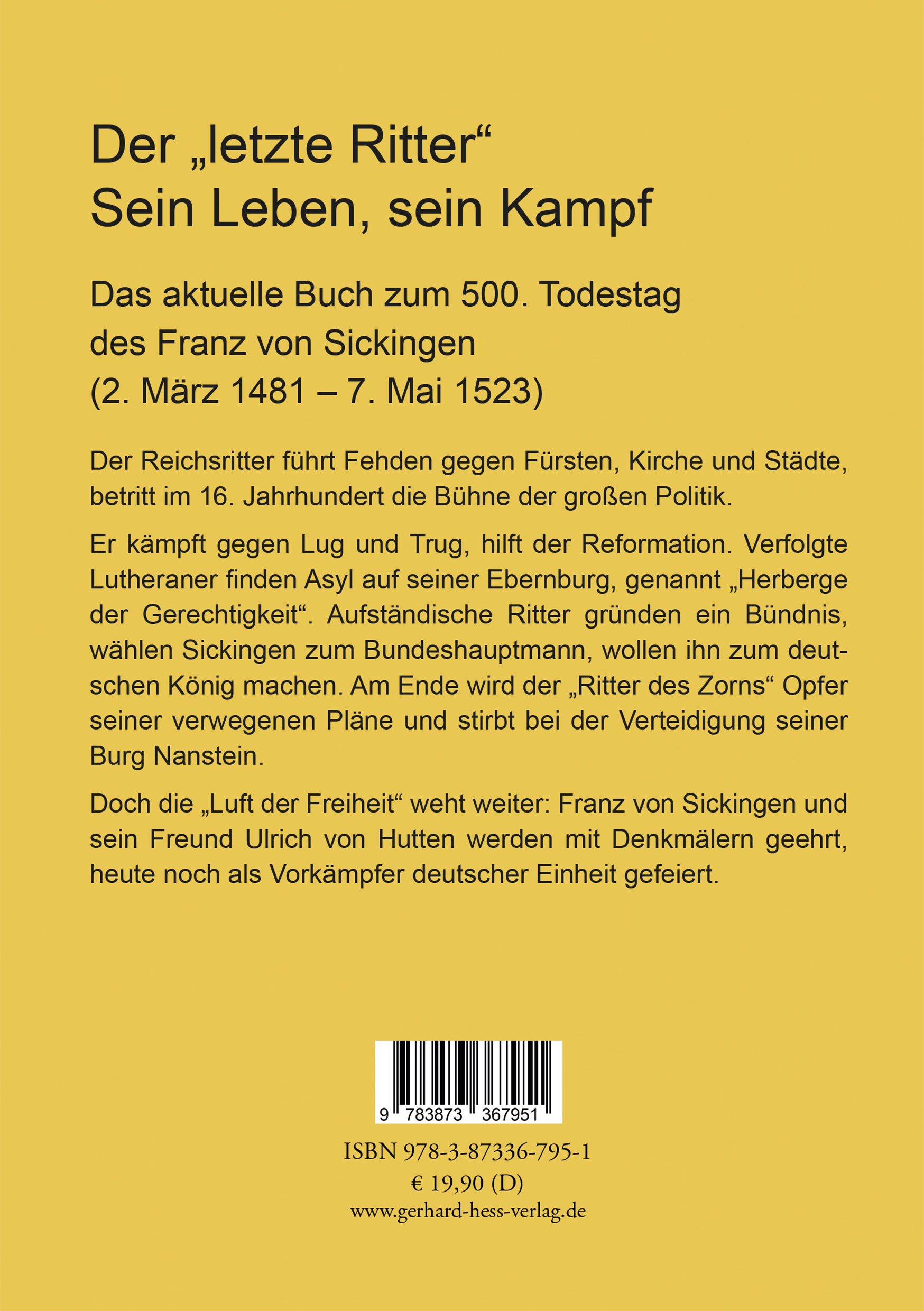 Der "letzte Ritter". Sein Leben, sein Kampf. Das aktuelle Buch zum 500. Todestag des Franz von Sickingen (2. März 1481 - 7. Mai 1523) Der Reichsritter führt Fehden gegen Fürsten, Kirche und Städte, betritt im 16. Jahrhundert die Bühne der großen Politik. Er kämpft gegen Lug und Trug, hilft der Reformation. Verfolgte Lutheraner finden Asyl auf seiner Ebernburg, genannt "Herberge der Gerechtigkeit". Aufständische Ritter gründen ein Bündnis, wählen Sickingen zum Bundeshauptmann, wollen ihn zum deutschen König machen. Am Ende wird der "Ritter des Zorns" Opfer seiner verwegenen Pläne und stirbt bei der Verteidigung seiner Burg Nanstein. Doch die "Luft der Freiheit" weht weiter: Franz von Sickingen und sein Freund Ulrich von Hutten werden mit Denkmälern geehrt, heute noch als Vorkämpfer deutscher Einheit gefeiert.