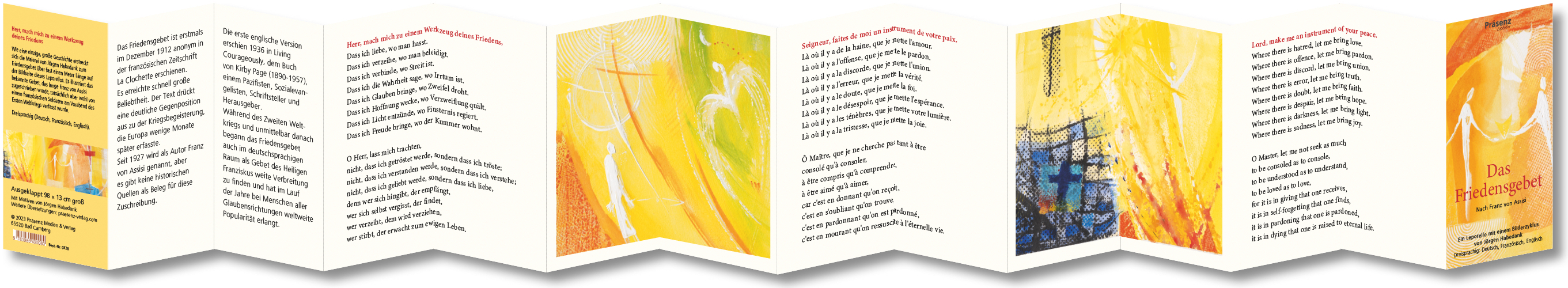 Herr, mach mich zu einem Werkzeug deines FriedensWie eine einzige, große Geschichte erstreckt sich die Malerei von Jörgen Habedank über fast einen Meter Länge auf der Bildseite dieses Leporellos. Es illustriert das bekannte Gebet, das lange Franz von Assisi zugeschrieben wurde, tatsächlich aber wohl von einem französischen Soldaten am Vorabend des Ersten Weltkriegs verfasst wurde.