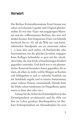 "Bereits zu Gennats Lebzeiten setzte ihm 1931 der Regisseur Fritz Lang ein Denkmal in seinem Film "M", in dem der Kriminalkommissar Lohmann Ernst Gennat nachgebildet war. Auch in den Gereon-Rath-Krimis von Volker Kutscher spielt Gennat eine prominente Rolle, was ab 24. Januar erneut zu sehen sein wird, wenn die dritte Staffel der auf den Kutscher-Krimis basierenden Serie "Babylon Berlin" startet. Gennat wird da wieder von Udo Samel verkörpert. Der Mythos Gennat lebt fort." Bettina Müller, taz