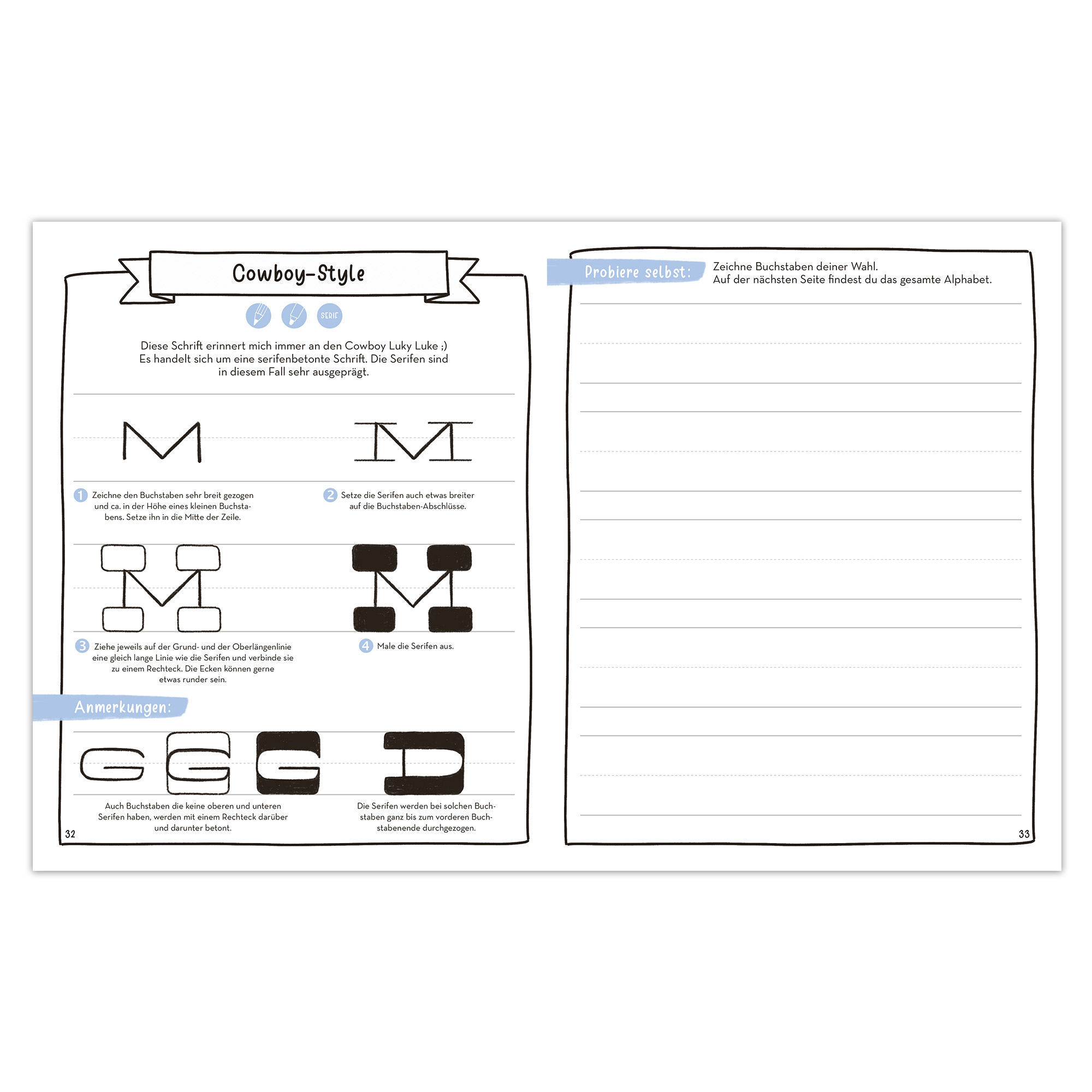 Zu jedem Alphabet gibt es eine step-by-step-Anleitung, Tipps oder Varianten und ein fertiges Lettering-Beispiel, bei dem die Schrift eingesetzt wird. Und das Beste ist: Du kannst alles direkt im Block üben!
