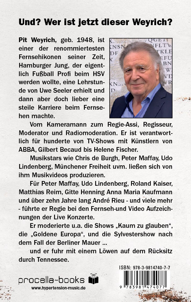 Pit Weyrich, geb. 1948, ist einer der renommiertesten Fernsehikonen seiner Zeit, Hamburger Jung, der eigentlich Fußball Profi beim HSV werden wollte, eine Lehrstunde von Uwe Seeler erhielt und dann aber doch lieber eine steile Karriere beim Fernsehen machte. Vom Kameramann zum Regie-Assi, Regisseur, Moderator und Radiomoderation. Er ist verantwortlich für hunderte von TV-Shows mit Künstlern von ABBA, Gilbert Becaud bis Helene Fischer. Musikstars wie Chris de Burgh, Peter Maffay, Udo Lindenberg, Münchener Freiheit uvm. ließen sich von ihm Musikvideos produzieren. Für Peter Maffay, Udo Lindenberg, Roland Kaiser, Matthias Reim, Gitte Henning Anna Maria Kaufmann und über 10 Jahre lang André Rieu - und viele mehr - führte er Regie bei den Fernseh-und Video Aufzeichnungen der Live Konzerte. Er moderierte u.a. die Shows "Kaum zu glauben", die "Goldene Europa", und die Sylvestershow nach dem Fall der Berliner Mauer ... und er fuhr mit einem Löwen auf dem Rücksitz durch Tennessee.