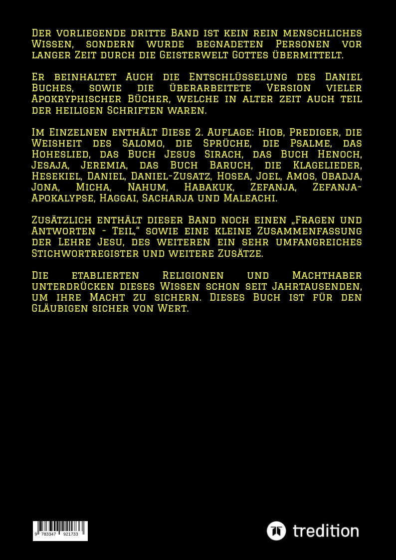 | Schlagworte | 3. Weltkrieg • Apokryphen • beweise für gott • Danielbuch Entschlüsselung • Der Hirte des Hermas • Entstehung des Lebens • Esra • Esrabücher • Fälschungen der Bibel • Geheimes Wissen • Geisterwelt • Gericht Gottes • Gott • göttliche Offenbarungen • Heilige Schriften • Henoch • Henochbuch • Inhalt der Urbibel • Jenseits • Jenseitserfahrungen • Leben nach dem Tod • Prophezeiungen • Sinn des Lebens • Tod • Urbibel • Visionen • Voraussagen • Wahre Religion • Was geschieht nach dem Tod • Weltgericht • Wiederkunft Jesu • Wissen • Zukünftige Ereignisse |