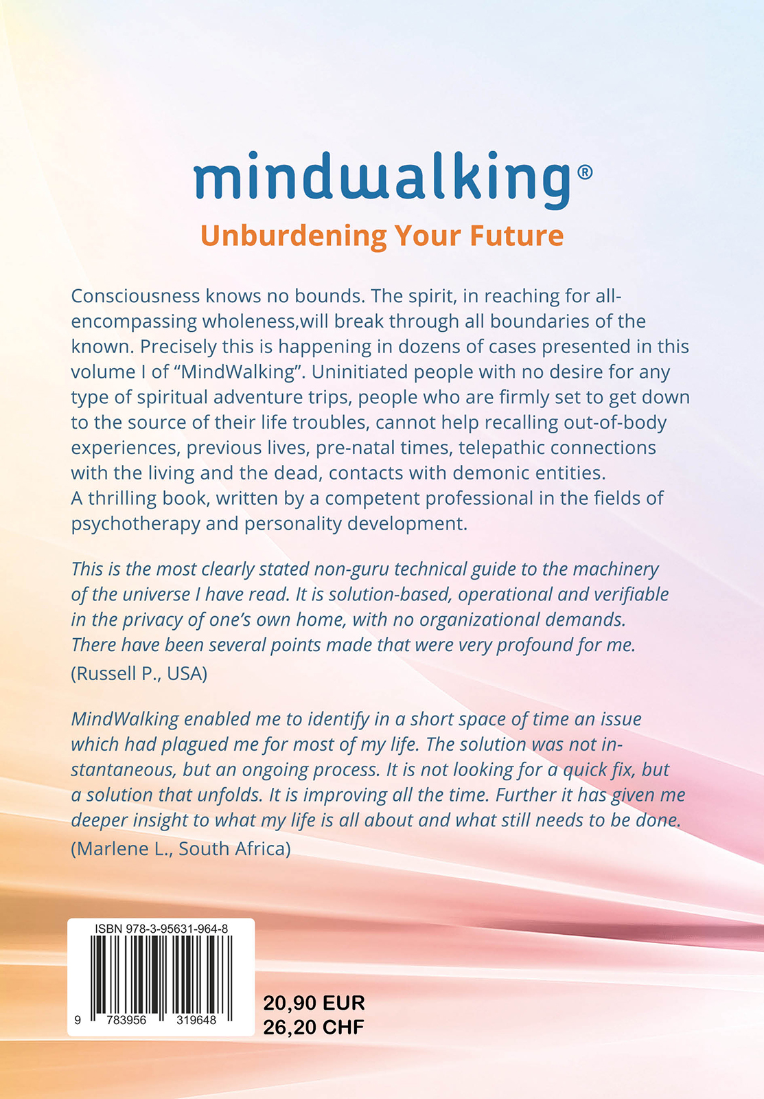 In vol. I of “MindWalking”, some dozens of cases are presented where uninitiated people with no desire for any spiritual adventure trip are seen to break through all boundaries of the known. Attempting to get down to the source of their life troubles they cannot help recalling out-of-body experiences, pre-natal times, and previous lives not even their own. They engage in telepathic connections with the living and the dead, and undergo shamanic experiences. A thrilling book, written by a competent professional in the fields of transpersonal psychotherapy and personality development.