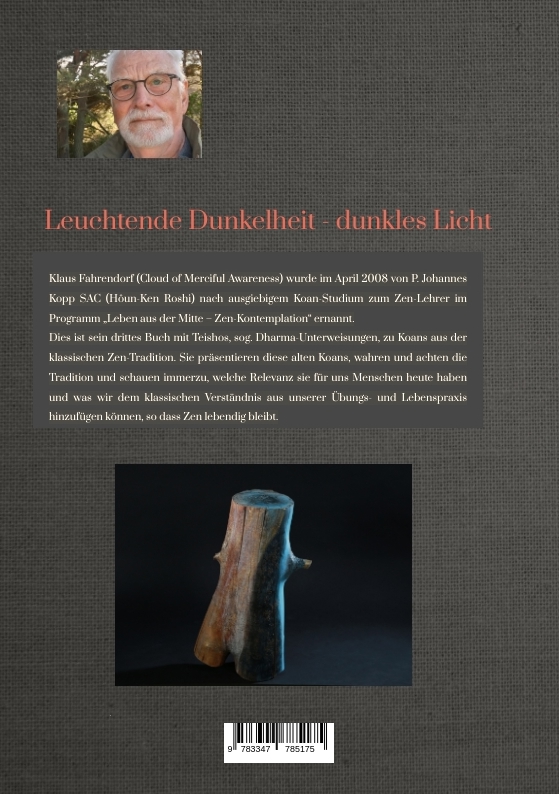 ZUM AUTOR: Klaus Fahrendorf, geb. 1947 in Gelsenkirchen-Buer. Studium der Rechtswissenschaft, Dr. jur., Richter, Ruhestand 2012. Verheiratet, zwei Söhne. Zen- Praxis seit 1989. 1990 Schüler bei P. Johannes Kopp (Hôun-ken Roshi). 2008 Ernennung zum Zen-Lehrer (Cloud of Merciful Awareness) im „Programm Leben aus der Mitte – Zen-Kontemplation im Bistum Essen“ zusammen mit Marlis Fahrendorf (Cloud of Infinite Beginning; verst. 9. 12. 2008). 2009 Gründung der Regionalgruppe Bochum. Seit 2015 auch Zen-Kurse im Kardinal-Hengsbach-Haus in Essen-Werden. Nach Schließung des Kardinal-Hengsbach-Hauses Kurse in verschiedenen anderen Häusern.