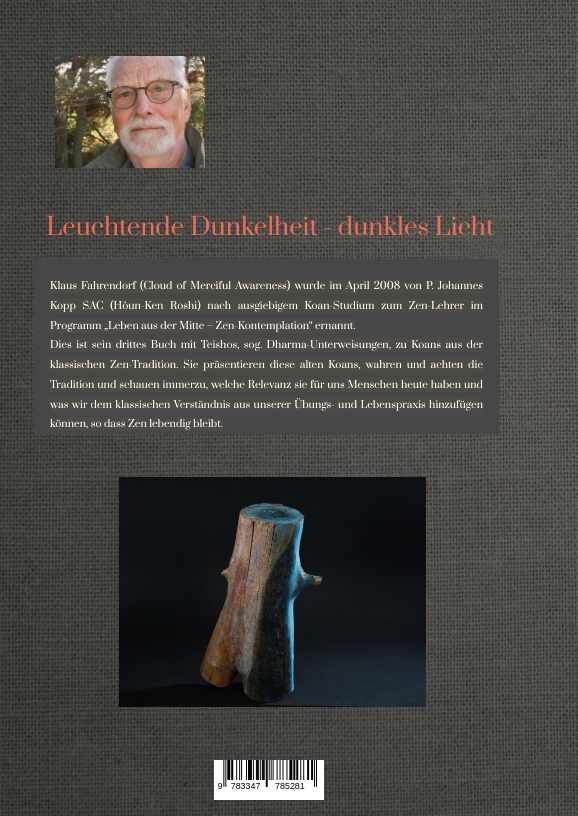 ZUM AUTOR: Klaus Fahrendorf, geb. 1947 in Gelsenkirchen-Buer. Studium der Rechtswissenschaft, Dr. jur., Richter, Ruhestand 2012. Verheiratet, zwei Söhne. Zen- Praxis seit 1989. 1990 Schüler bei P. Johannes Kopp (Hôun-ken Roshi). 2008 Ernennung zum Zen-Lehrer (Cloud of Merciful Awareness) im „Programm Leben aus der Mitte – Zen-Kontemplation im Bistum Essen“ zusammen mit Marlis Fahrendorf (Cloud of Infinite Beginning; verst. 9. 12. 2008). 2009 Gründung der Regionalgruppe Bochum. Seit 2015 auch Zen-Kurse im Kardinal-Hengsbach-Haus in Essen-Werden. Nach Schließung des Kardinal-Hengsbach-Hauses Kurse in verschiedenen anderen Häusern.