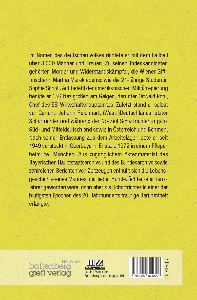 | Schlagworte | 1893-1972 • 21-jährig • amerikanis • Arbeitslager • Befehl • Deutsch • deutsches Volk • Deutschland • Giftmischerin • Johann Reichhardt • Johann Reichhart • Martha Marek • Militär • Militärregierung • Mord • Mörder • NS-Zeit • Scharfrichter • Sophie Scholl • Studentin • Todeskandidaten • Widerstandskämpfer • Wien • Wiener |