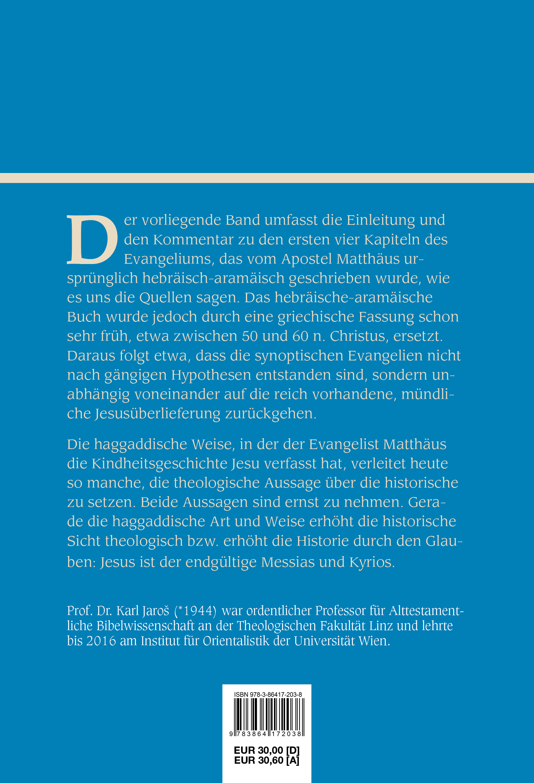 Prof. Dr. Karl Jaroš (*1944) war ordentlicher Professor für Alttestamentliche Bibelwissenschaft an der Theologischen Fakultät Linz und lehrte bis 2016 am Institut für Orientalistik der Universität Wien.