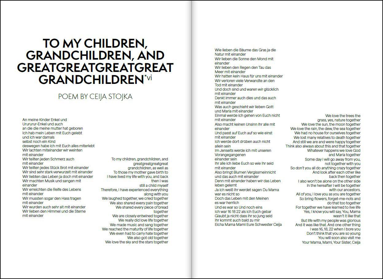 Stojka überlebte als Kind die drei Konzentrationslager Ravensbrück, Bergen-Belsen und Auschwitz. In ihren Werken schildert sie ihre persönlichen Erfahrungen mit Verhaftung, Vernichtung, Überleben und Befreiung, die Millionen Menschen teilten. 2023 jährt sich ihr Geburtstag zum 90. Mal und ihr Todestag zum 10. Mal. In diesem Jahr feiern wir zugleich den 30. Jahrestag der offiziellen Anerkennung der Roma als Volksgruppe in Österreich (1993), für die sich Ceija Stojka jahrelang gemeinsam mit anderen österreichischen Roma stark gemacht hatte, um endlich vollwertiger Teil der Gesellschaft zu sein.