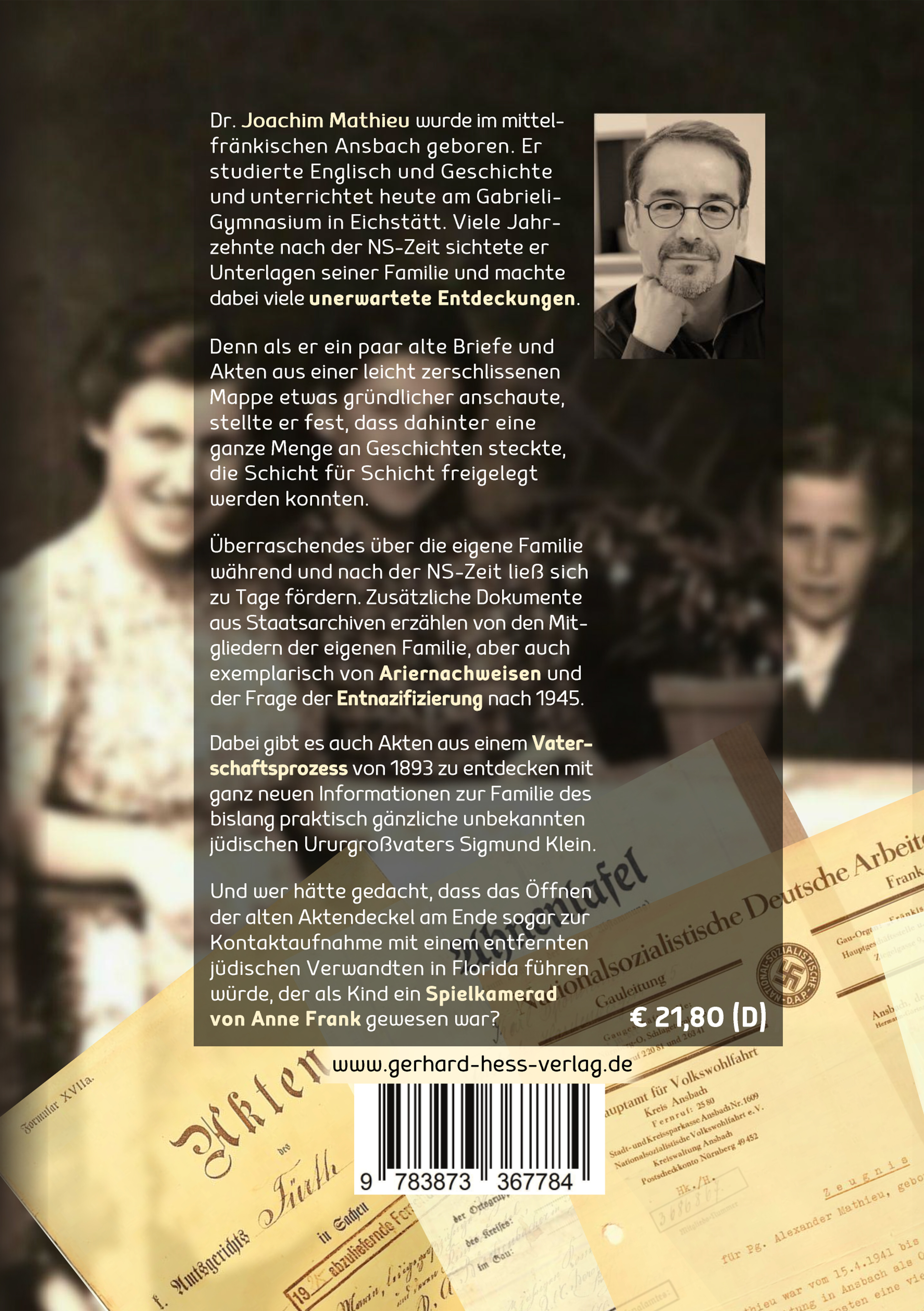 Dr. Joachim Mathieu wurde im mittelfränkischen Ansbach geboren. Er studierte Englisch und Geschichte und unterrichtet heute am Gabrieli-Gymnasium in Eichstätt. Viele Jahrzehnte nach der NS-Zeit sichtete er Unterlagen seiner Familie und machte dabei viele unerwartete Entdeckungen. Denn als er ein par alte Briefe und Akten aus einer leicht zerschlissenen Mappe etwas gründlicher anschaute, stellte er fest, dass dahinter eine ganze Menge an Geschichten steckte, die Schicht für Schicht freigelegt werden konnten. Überraschendes über die eigene Familie während und nach der NS-Zeit ließ sich zu Tage fördern. Zusätzliche Dokumente aus Staatsarchiven erzählen von den Mitgliedern der eigenen Familie, aber auch exemplarisch von Ariernachweisen und der Frage der Entnazifizierung nach 1945. Dabei gibt es auch Akten aus einem Vaterschaftsprozess von 1893 zu entdecken mit ganz neuen Informationen zur Familie des bislang praktisch gänzliche unbekannten jüdischen Ururgroßvaters Sigmund Klein. Und wer hätte gedacht, dass das Öffnen der alten Aktendeckel am Ende sogar zur Kontaktaufnahme mit einem entfernten jüdischen Verwandten in Florida führen würde, der als Kind ein Spielkamerad von Anne Frank gewesen war?