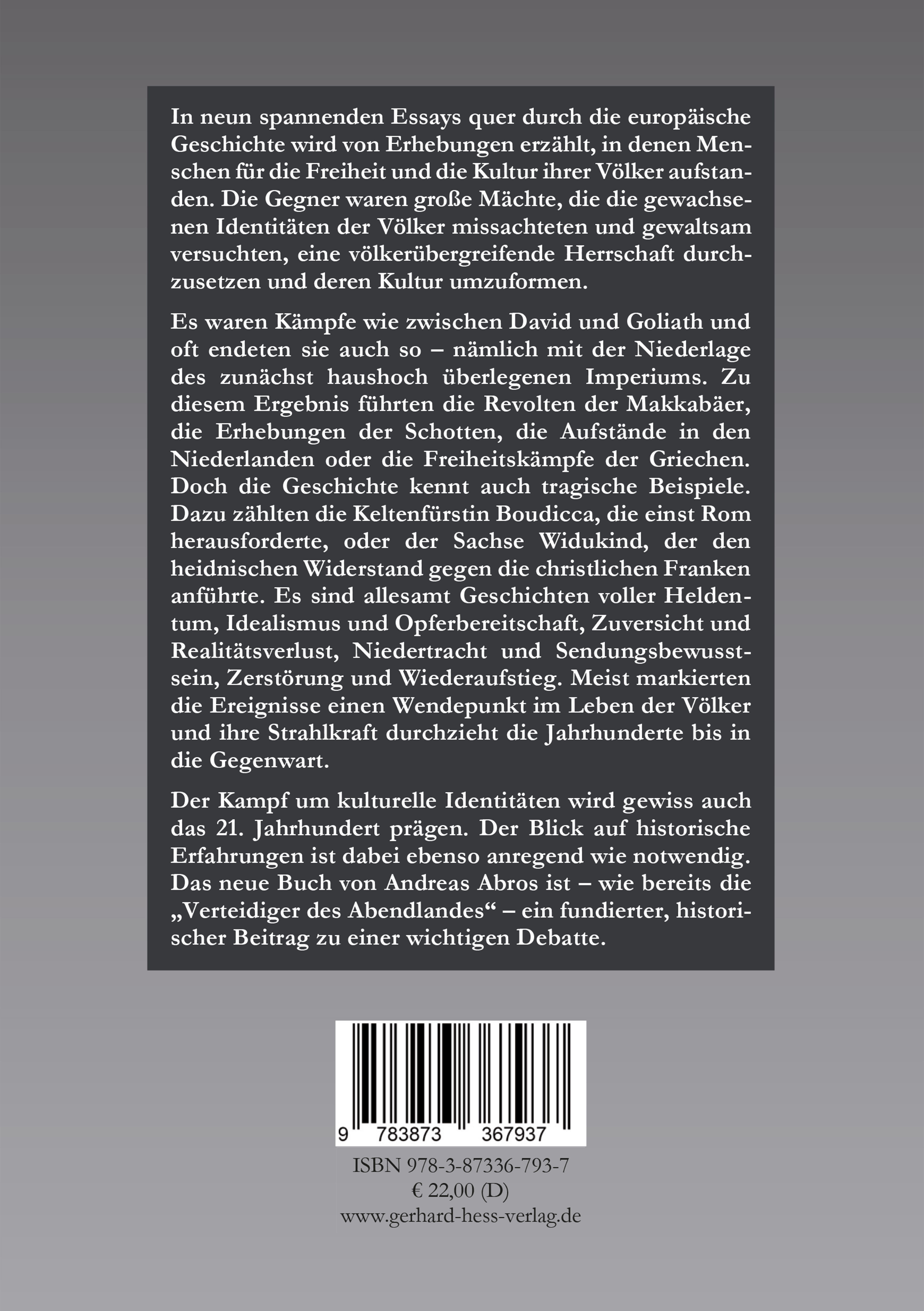 In neun spannenden Essays quer durch die europäische Geschichte wird von Erhebungen erzählt, in denen Menschen für die Freiheit und die Kultur ihrer Völker aufstanden. Die Gegner waren große Mächte, die die gewachsenen Identitäten der Völker missachteten und gewaltsam versuchten, eine völkerübergreifende Herrschaft durchzusetzen und deren Kultur umzuformen. Es waren Kämpfe wie zwischen David und Goliath und oft endeten sie auch so - nämlich mit der Niederlage des zunächst haushoch überlegenen Imperiums. Zu diesem Ergebnis führten die Revolten der Makkabäer, die Erhebungen der Schotten, die Aufstände in den Niederlanden oder die Freiheitskämpfe der Griechen. Doch die Geschichte kennt auch tragische Beispiele. Dazu zählten die Keltenfürstin Boudicca, die einst Rom herausforderte, oder der Sachse Widukind, der den heidnischen Widerstand gegen die christlichen Franken anführte. Es sind allesamt Geschichten voller Heldentum, Idealismus und Opferbereitschaft, Zuversicht und Realitätsverlust, Niedertracht und Sendungsbewusstsein, Zerstörung und Wiederaufstieg. Meist markierten die Ereignisse einen Wendepunkt im Leben der Völker und ihre Strahlkraft durchzieht die Jahrhunderte bis in die Gegenwart. Der Kampf um kulturelle Identitäten wird gewiss auch das 21. Jahrhundert prägen. Der Blick auf historische Erfahrungen ist dabei ebenso anregend wie notwendig. Das neue Buch von Andreas Abros ist - wie bereits die "Verteidiger des Abendlandes" - ein fundierter, historischer Beitrag zu einer wichtigen Debatte.