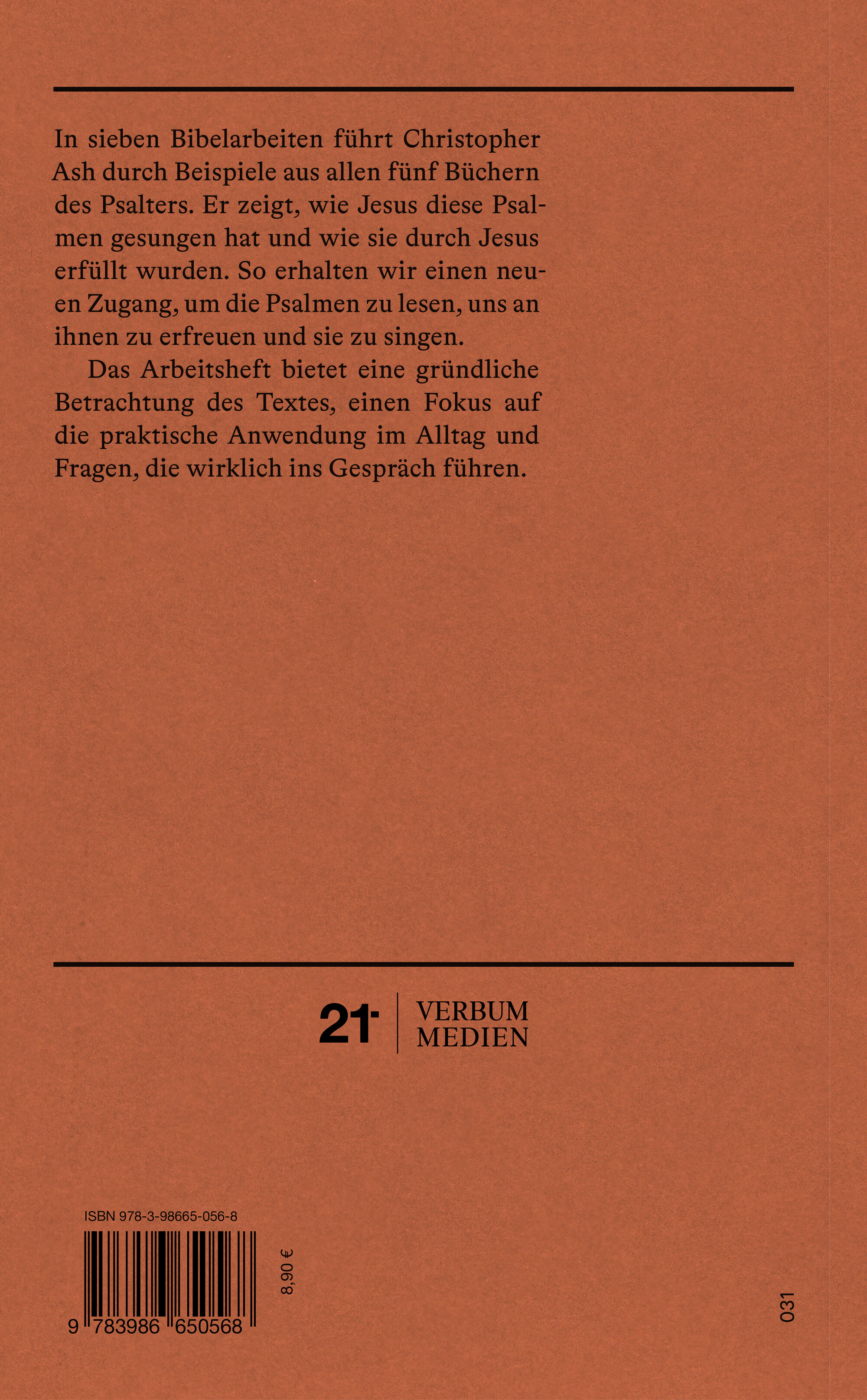 In sieben Bibelarbeiten führt Christopher Ash durch Beispiele aus allen fünf Büchern des Psalters. Er zeigt, wie sie zuerst und vor allem auf Jesus hinweisen und wie wir sie in diesem Licht auf unser Leben anwenden können.