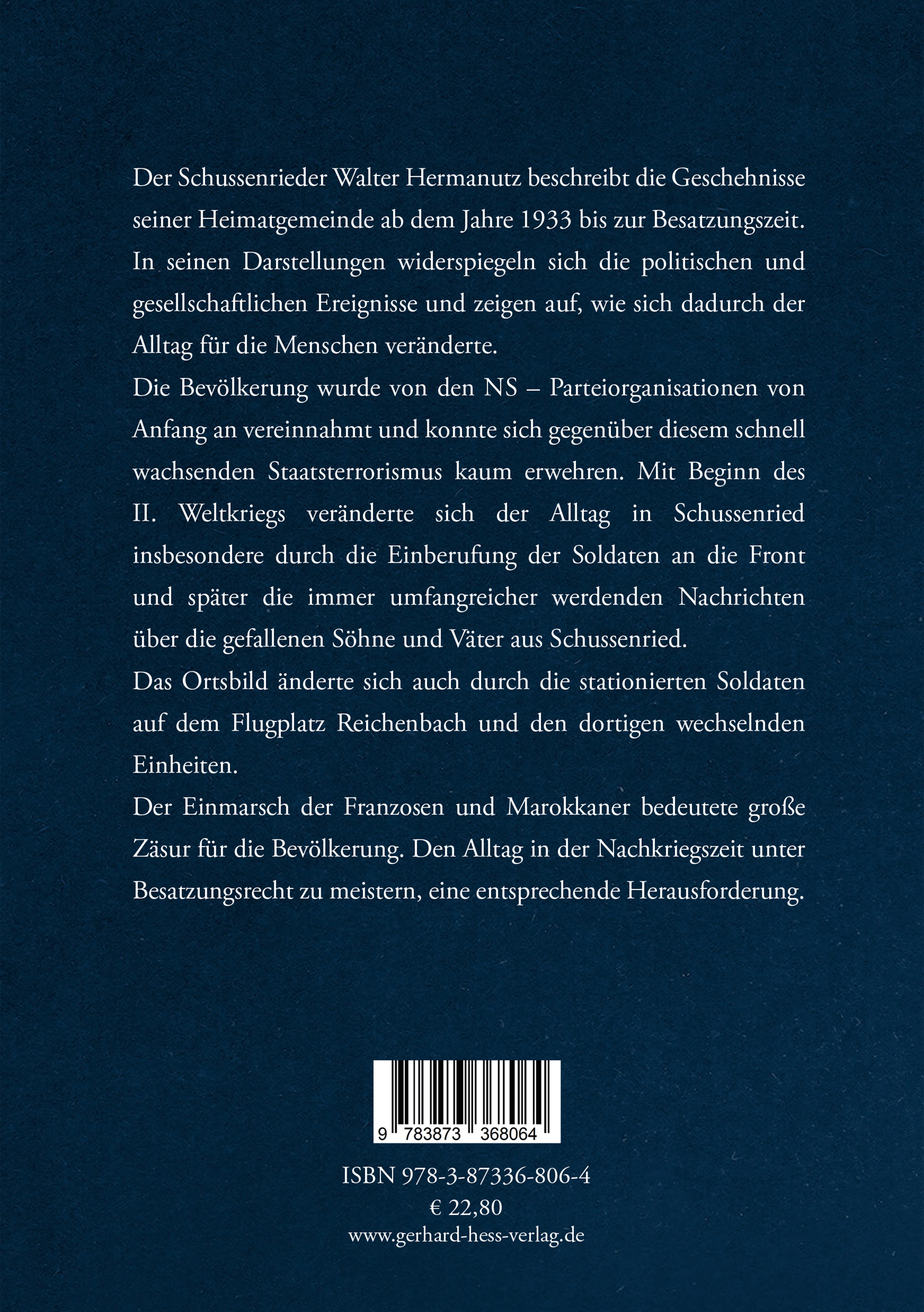 Der Schussenrieder Walter Hermanutz beschreibt die Geschehnisse seiner Heimatgemeinde ab dem Jahre 1933 bis zur Besatzungszeit. In seinen Darstellungen widerspiegeln sich die politischen und gesellschaftlichen Ereignisse und zeigen auf, wie sich dadurch der Alltag für die Menschen veränderte. Die Bevölkerung wurde von den NS - Parteiorganisationen von Anfang an vereinnahmt und konnte sich gegenüber diesem schnell wachsenden Staatsterrorismus kaum erwehren. Mit Beginn des II. Weltkriegs veränderte sich der Alltag in Schussenried insbesondere durch die Einberufung der Soldaten an die Front und später die immer umfangreicher werdenden Nachrichten über die gefallenen Söhne und Väter aus Schussenried. Das Ortsbild änderte sich auch durch die stationierten Soldaten auf dem Flugplatz Reichenbach und den dortigen wechselnden Einheiten. Der Einmarsch der Franzosen und Marokkaner bedeutete große Zäsur für die Bevölkerung. Den Alltag in der Nachkriegszeit unter Besatzungsrecht zu meistern, eine entsprechende Herausforderung.