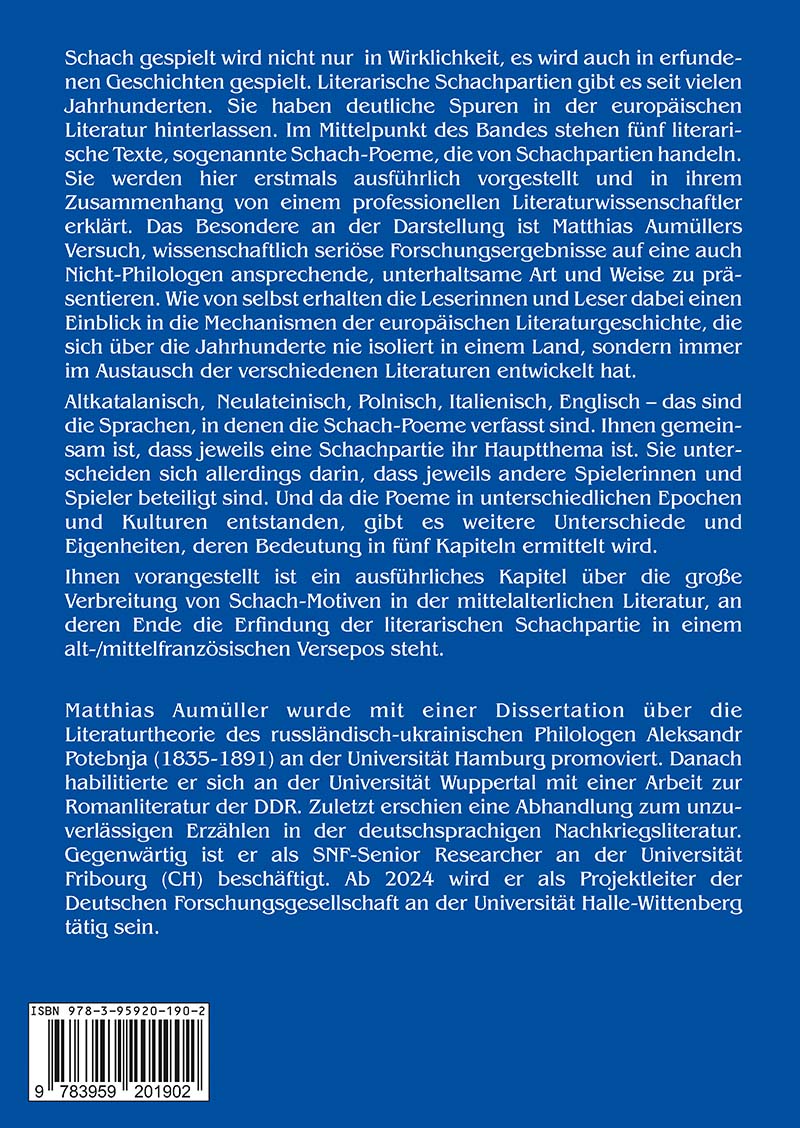 Von den Anfängen bis zu den großen Schach-Poemen der Frühen ZeitSchach gespielt wird nicht nur in Wirklichkeit, es wird auch in erfundenen Geschichten gespielt. Literarische Schachpartien gibt es seit vielen Jahrhunderten. Sie haben deutliche Spuren in der europäischen Literatur hinterlassen. Im Mittelpunkt des Bandes stehen fünf literarische Texte, sogenannte Schach-Poeme, die von Schachpartien handeln. Sie werden hier erstmals ausführlich vorgestellt und in ihrem Zusammenhang von einem professionellen Literaturwissenschaftler erklärt. Das Besondere an der Darstellung ist Matthias Aumüllers Versuch, wissenschaftlich seriöse Forschungsergebnisse auf eine auch Nicht-Philologen ansprechende, unterhaltsame Art und Weise zu präsentieren. Wie von selbst erhalten die Leserinnen und Leser dabei einen Einblick in die Mechanismen der europäischen Literaturgeschichte, die sich über die Jahrhunderte nie isoliert in einem Land, sondern immer im Austausch der verschiedenen Literaturen entwickelt hat.Altkatalanisch, Neulateinisch, Polnisch, Italienisch, Englisch - das sind die Sprachen, in denen die Schach-Poeme verfasst sind. Ihnen gemeinsam ist, dass jeweils eine Schachpartie ihr Hauptthema ist. Sie unterscheiden sich allerdings darin, dass jeweils andere Spielerinnen und Spieler beteiligt sind. Und da die Poeme in unterschiedlichen Epochen und Kulturen entstanden, gibt es weitere Unterschiede und Eigenheiten, deren Bedeutung in fünf Kapiteln ermittelt wird.Ihnen vorangestellt ist ein ausführliches Kapitel über die große Verbreitung von Schach-Motiven in der mittelalterlichen Literatur, an deren Ende die Erfindung der literarischen Schachpartie in einem alt-/mittelfranzösischen Versepos steht. Matthias Aumüller wurde mit einer Dissertation über die Literaturtheorie des russländisch-ukrainischen Philologen Aleksandr Potebnja (1835-1891) an der Universität Hamburg promoviert. Danach habilitierte er sich an der Universität Wuppertal mit einer Arbeit zur Romanliteratur der DDR. Zuletzt erschien eine Abhandlung zum unzuverlässigen Erzählen in der deutschsprachigen Nachkriegsliteratur. Gegenwärtig ist er als SNF-Senior Researcher an der Universität Fribourg (CH) beschäftigt. Ab 2024 wird er als Projektleiter der Deutschen Forschungsgesellschaft an der Universität Halle-Wittenberg tätig sein.