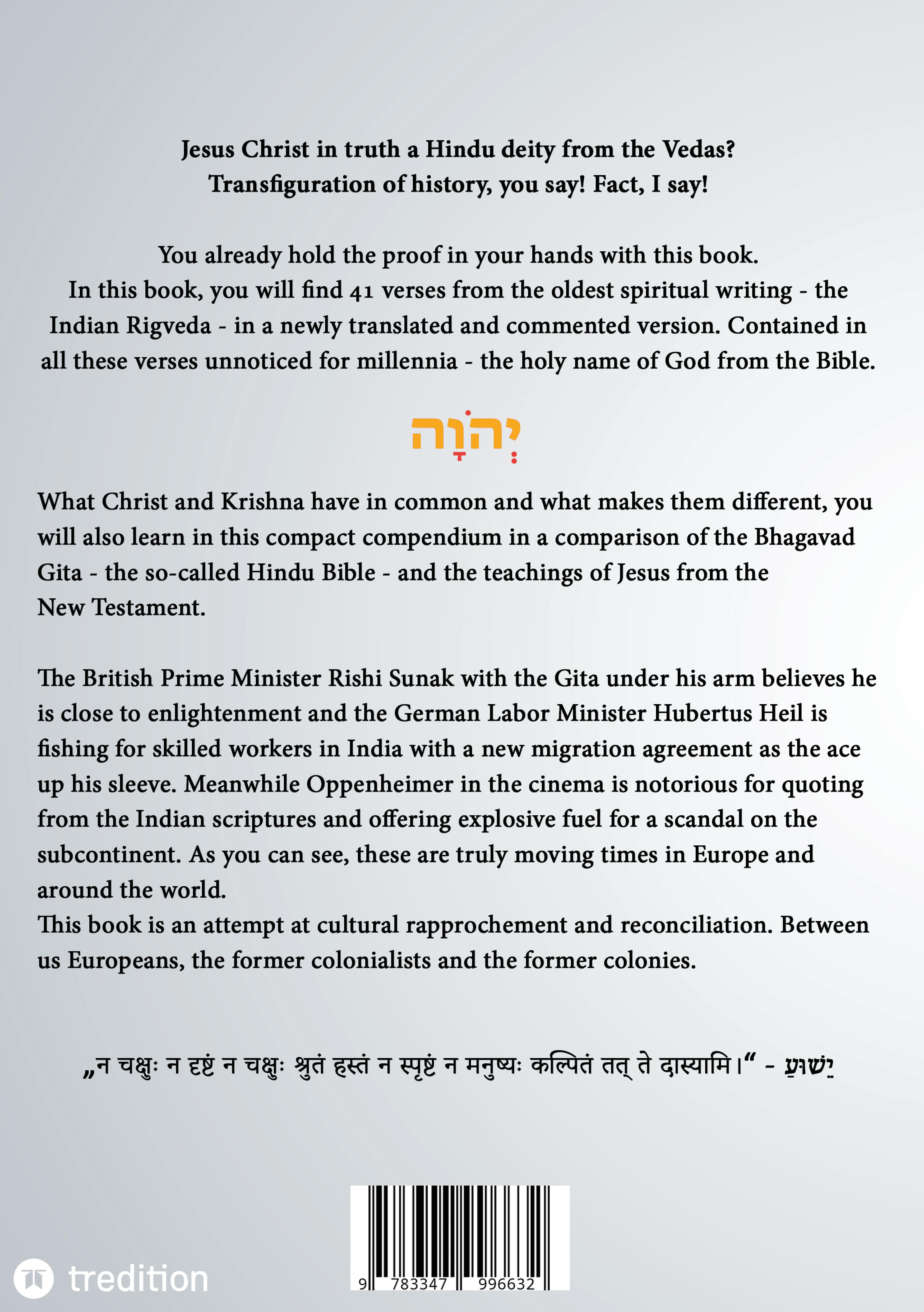 Jesus Christ in truth a Hindu deity from the Vedas? Transfiguration of history, you say! Fact, I say! You already hold the proof in your hands with this book.In this book, you will find 41 verses from the oldest spiritual writing - the Indian Rigveda - in a newly translated and commented version. Contained in all these verses unnoticed for millennia - the holy name of God from the Bible. What Christ and Krishna have in common and what makes them different, you will also learn in this compact compendium in a comparison of the Bhagavad Gita - the so-called Hindu Bible - and the teachings of Jesus from the New Testament.The British Prime Minister Rishi Sunak with the Gita under his arm believes he is close to enlightenment and the German Labor Minister Hubertus Heil is fishing for skilled workers in India with a new migration agreement as the ace up his sleeve. Meanwhile Oppenheimer in the cinema is notorious for quoting from the Indian scriptures and offering explosive fuel for a scandal on the subcontinent. As you can see, these are truly moving times in Europe and around the world.This book is an attempt at cultural rapprochement and reconciliation. Between us Europeans, the former colonialists and the former colonies." " -