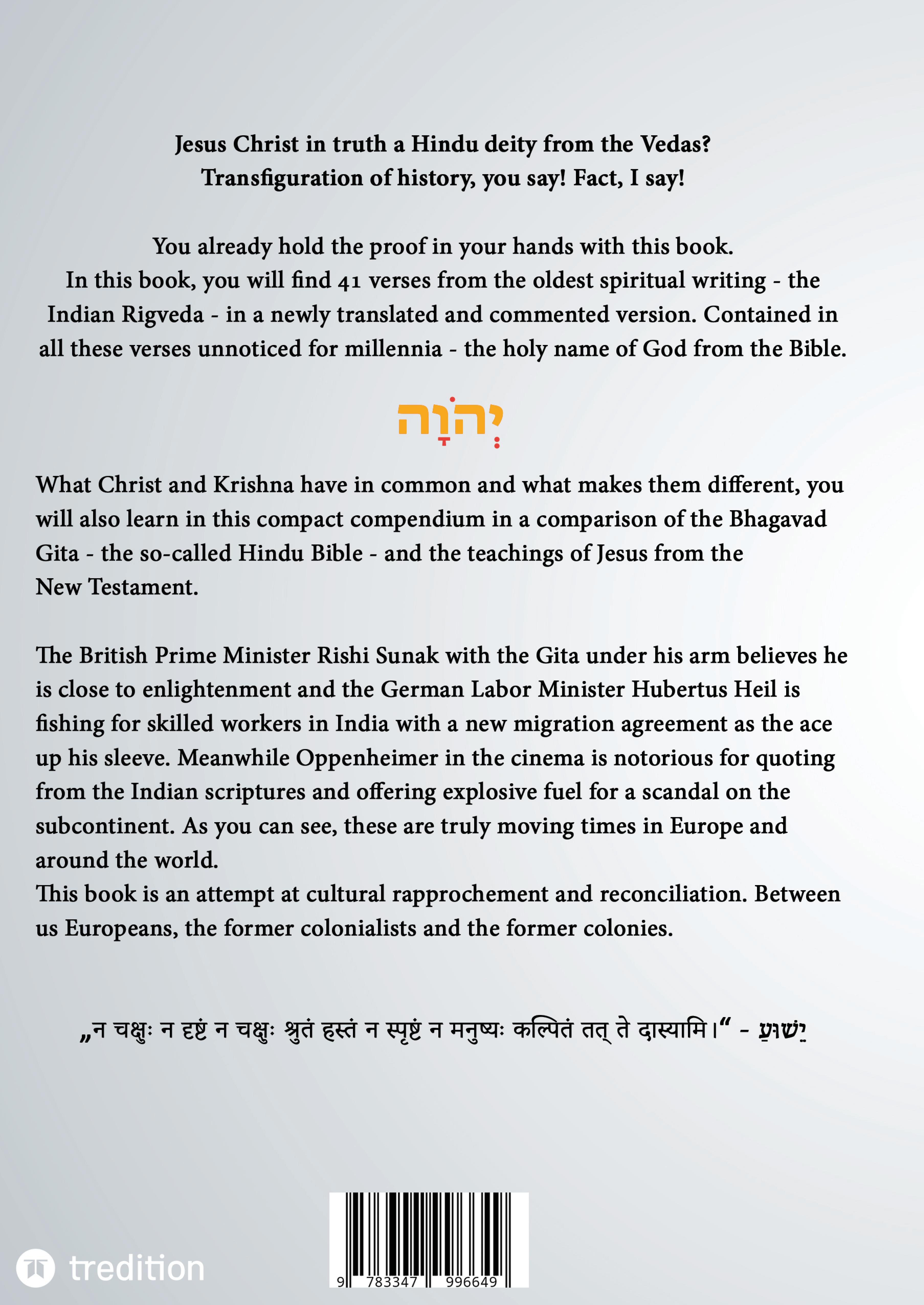 Jesus Christ in truth a Hindu deity from the Vedas? Transfiguration of history, you say! Fact, I say! You already hold the proof in your hands with this book.In this book, you will find 41 verses from the oldest spiritual writing - the Indian Rigveda - in a newly translated and commented version. Contained in all these verses unnoticed for millennia - the holy name of God from the Bible. What Christ and Krishna have in common and what makes them different, you will also learn in this compact compendium in a comparison of the Bhagavad Gita - the so-called Hindu Bible - and the teachings of Jesus from the New Testament.The British Prime Minister Rishi Sunak with the Gita under his arm believes he is close to enlightenment and the German Labor Minister Hubertus Heil is fishing for skilled workers in India with a new migration agreement as the ace up his sleeve. Meanwhile Oppenheimer in the cinema is notorious for quoting from the Indian scriptures and offering explosive fuel for a scandal on the subcontinent. As you can see, these are truly moving times in Europe and around the world.This book is an attempt at cultural rapprochement and reconciliation. Between us Europeans, the former colonialists and the former colonies." " -