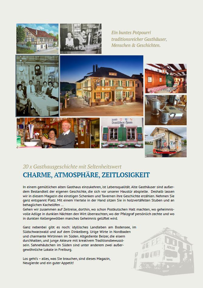 In einem gemütlichen alten Gasthaus einzukehren, ist Lebensqualität. Alte Gasthäuser sind außerdem Bestandteil der eigenen Geschichte, die sich vor unserer Haustür abspielte. Deshalb lassen wir in diesem Magazin die einstigen Schenken und Tavernen ihre Geschichte erzählen. Nehmen Sie ganz entspannt Platz. Mit einem Viertele in der Hand sitzen Sie in holzvertäfelten Stuben und an behaglichen Kachelöfen … Gehen wir zusammen auf Zeitreise, dorthin, wo schon Postkutschen Halt machten, wo geheimnisvolle Adlige in dunklen Nächten den Wirt überraschten, wo der Pfalzgraf persönlich zechte und wo in dunklen Kellergewölben manches Geheimnis gelüftet wird. Ganz nebenbei gibt es noch: idyllisches Landleben am Bodensee, im Südschwarzwald und auf dem Dinkelberg. Urige Wirte in Nordbaden und charmante Wirtinnen im Süden. Altgediente Beizer, die eisern durchhalten, und junge Akteure mit kreativem Traditionsbewusstsein. Sahnehäubchen im Süden sind unter anderem zwei außergewöhnliche Lokale in