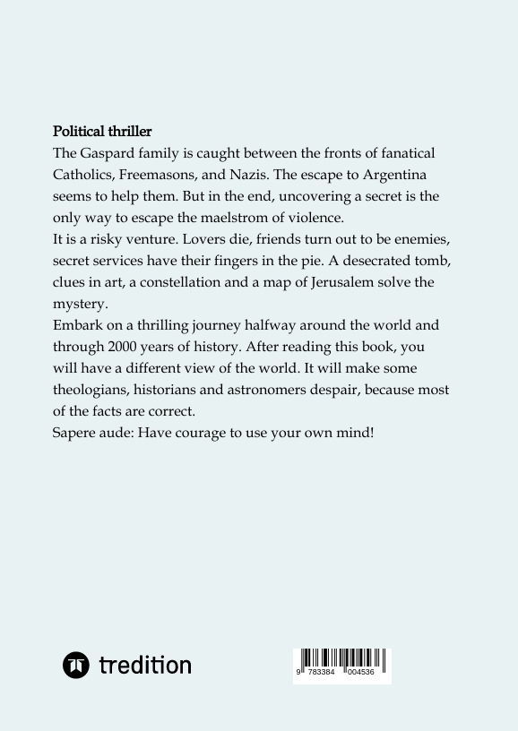 | Schlagworte | British secret service • Buenos Aires • fanatical Catholics • freemasons • Hadrian VI. • Jesus • Leuven • Maria Magdalena • Nazis • Paris • Pope • Propaganda Due • Second World War • Vatikan • war criminal • Zaragosza |