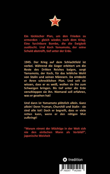 1945. Der Krieg auf dem Schlachtfeld ist vorbei. Während die Sieger erbittert um die Reste des Dritten Reiches balgen, sorgt Yamamoto, der Koch, für das leibliche Wohl von Stalin und seinen Männern. Da entdeckt er ihren schrecklichen Plan. Und seit sie wissen, dass er es weiß, wollen sie ihn zum Schweigen bringen. Bis tief unter die Erde verschleppen sie ihn. Niemand soll erfahren, was er gesehen hat!Und dann ist Yamamoto plötzlich allein. Ganz allein! Denn Truman, Churchill und Stalin - sie sind alle tot! Doch er begreift, dass er viele retten kann, wenn er den nötigen Mut aufbringt!Ein tückischer Plan, um den Frieden zu ermorden - gleich wieder, nach dem Krieg. Eine furchtbare Bombe, die die Ewigkeit auslöscht. Und Koch Yamamoto, der seine Schuld abstreift, tief unter der Erde.