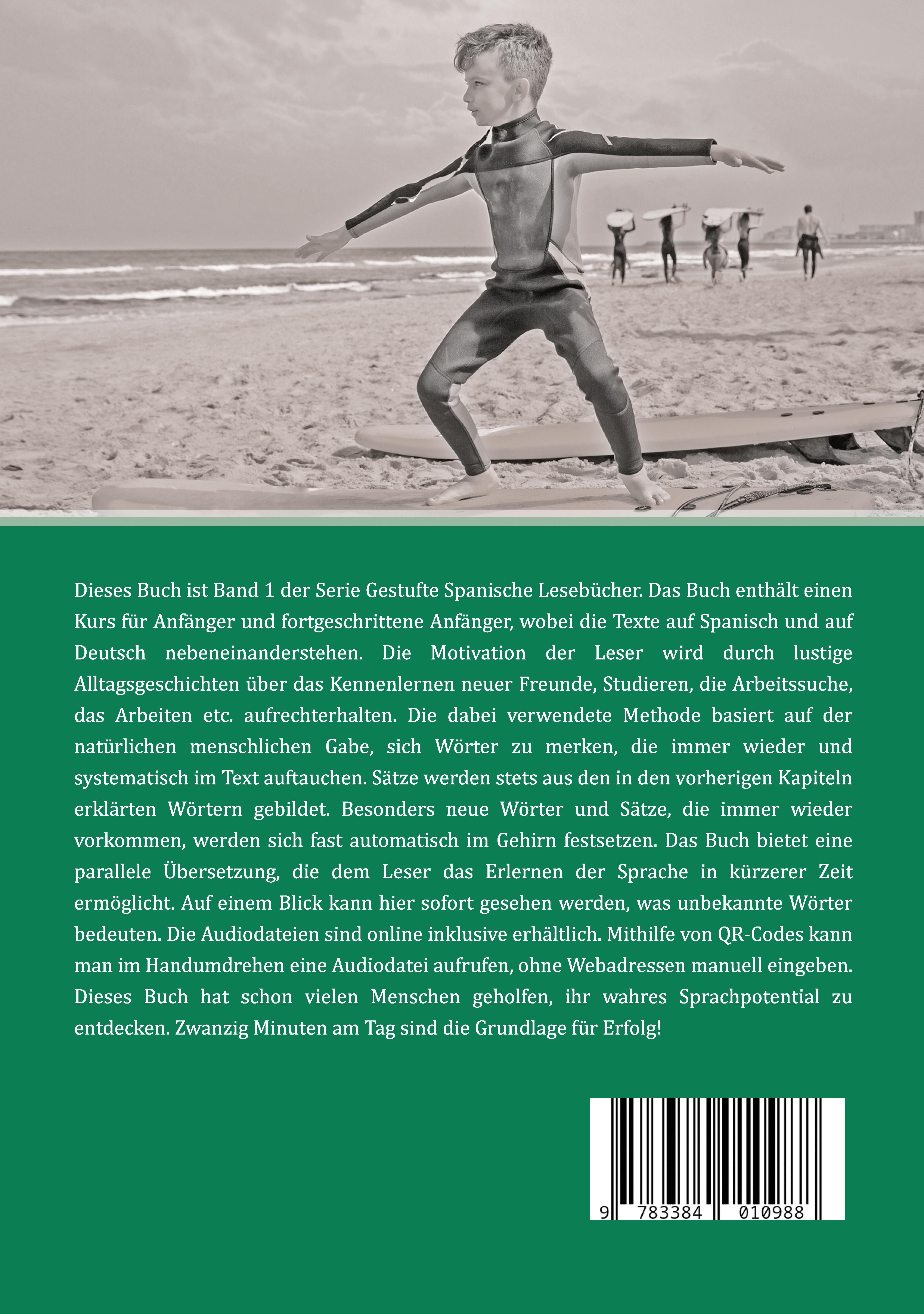 Dieses Buch ist Band 1 der Serie Gestufte Spanische Lesebücher. Das Buch enthält einen Kurs für Anfänger und fortgeschrittene Anfänger, wobei die Texte auf Spanisch und auf Deutsch nebeneinanderstehen. Die Motivation der Leser wird durch lustige Alltagsgeschichten über das Kennenlernen neuer Freunde, Studieren, die Arbeitssuche, das Arbeiten etc. aufrechterhalten. Die dabei verwendete Methode basiert auf der natürlichen menschlichen Gabe, sich Wörter zu merken, die immer wieder und systematisch im Text auftauchen. Sätze werden stets aus den in den vorherigen Kapiteln erklärten Wörtern gebildet. Besonders neue Wörter und Sätze, die immer wieder vorkommen, werden sich fast automatisch im Gehirn festsetzen. Das Buch bietet eine parallele Übersetzung, die dem Leser das Erlernen der Sprache in kürzerer Zeit ermöglicht. Auf einem Blick kann hier sofort gesehen werden, was unbekannte Wörter bedeuten. Die Audiodateien sind online inklusive erhältlich. Mithilfe von QR-Codes kann man im Handumdrehen eine Audiodatei aufrufen, ohne Webadressen manuell eingeben. Dieses Buch hat schon vielen Menschen geholfen, ihr wahres Sprachpotential zu entdecken. Zwanzig Minuten am Tag sind die Grundlage für Erfolg!
