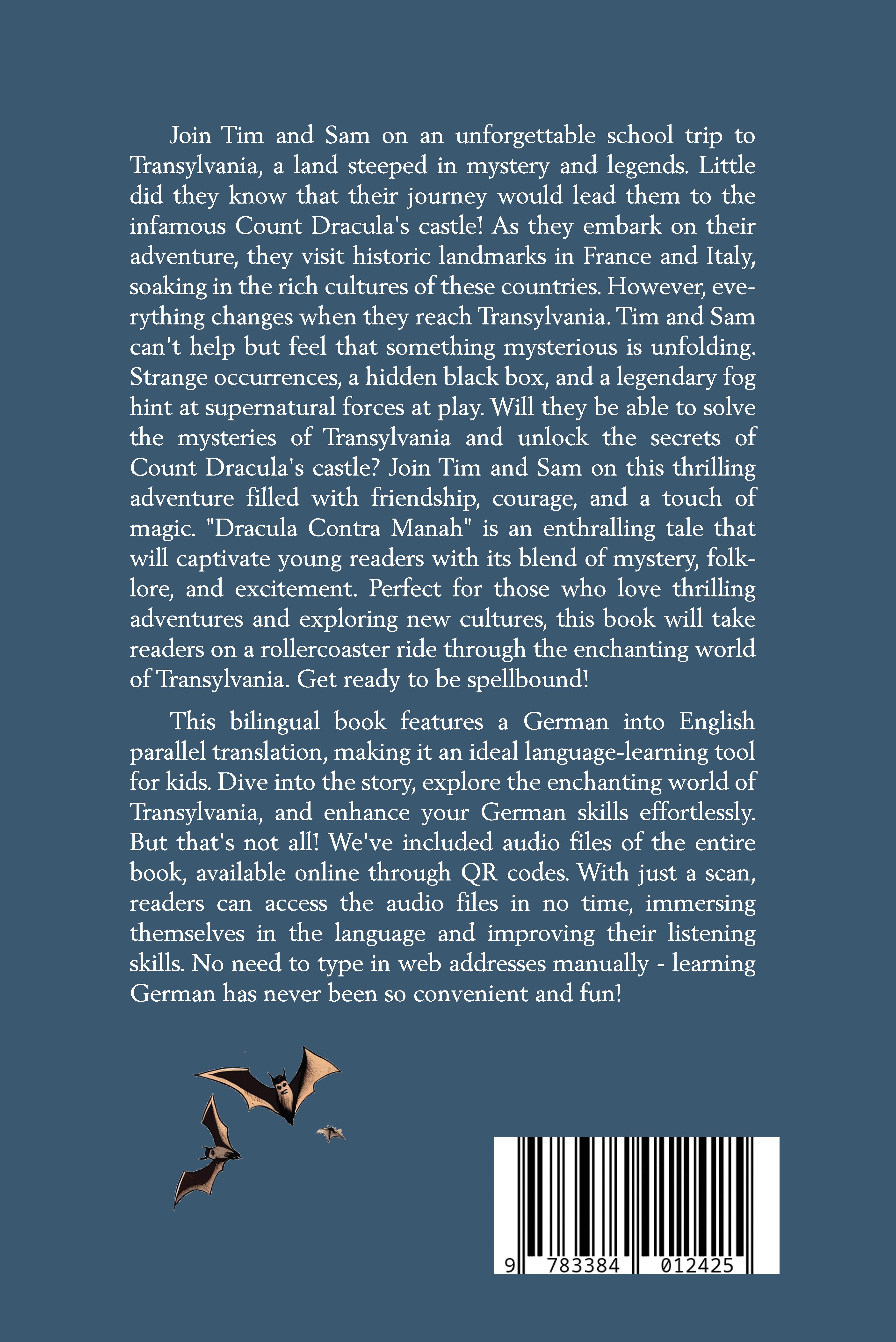 Join Tim and Sam on an unforgettable school trip to Transylvania, a land steeped in mystery and legends. Little did they know that their journey would lead them to the infamous Count Dracula's castle! As they embark on their adventure, they visit historic landmarks in France and Italy, soaking in the rich cultures of these countries. However, everything changes when they reach Transylvania. Tim and Sam can't help but feel that something mysterious is unfolding. Strange occurrences, a hidden black box, and a legendary fog hint at supernatural forces at play. Will they be able to solve the mysteries of Transylvania and unlock the secrets of Count Dracula's castle? Join Tim and Sam on this thrilling adventure filled with friendship, courage, and a touch of magic. "Dracula Contra Manah" is an enthralling tale that will captivate young readers with its blend of mystery, folklore, and excitement. Perfect for those who love thrilling adventures and exploring new cultures, this book will take readers on a rollercoaster ride through the enchanting world of Transylvania. Get ready to be spellbound!This bilingual book features a German into English parallel translation, making it an ideal language-learning tool for kids. Dive into the story, explore the enchanting world of Transylvania, and enhance your German skills effortlessly. But that's not all! We've included audio files of the entire book, available online through QR codes. With just a scan, readers can access the audio files in no time, immersing themselves in the language and improving their listening skills. No need to type in web addresses manually - learning German has never been so convenient and fun!